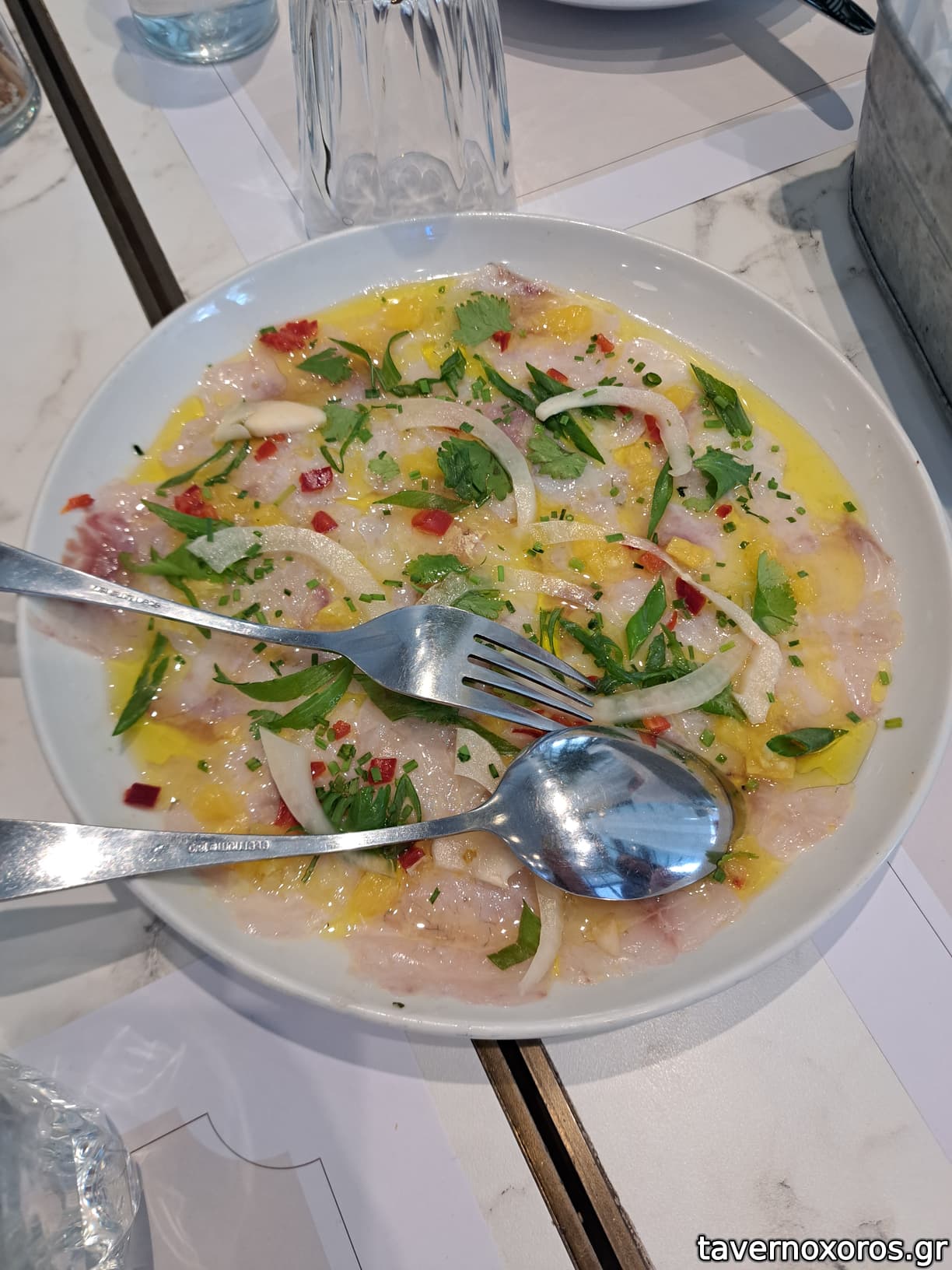 Καρπάτσιο λαυράκι, φρέσκο τσίλι & εσπεριδοειδή (πολύ καλό)