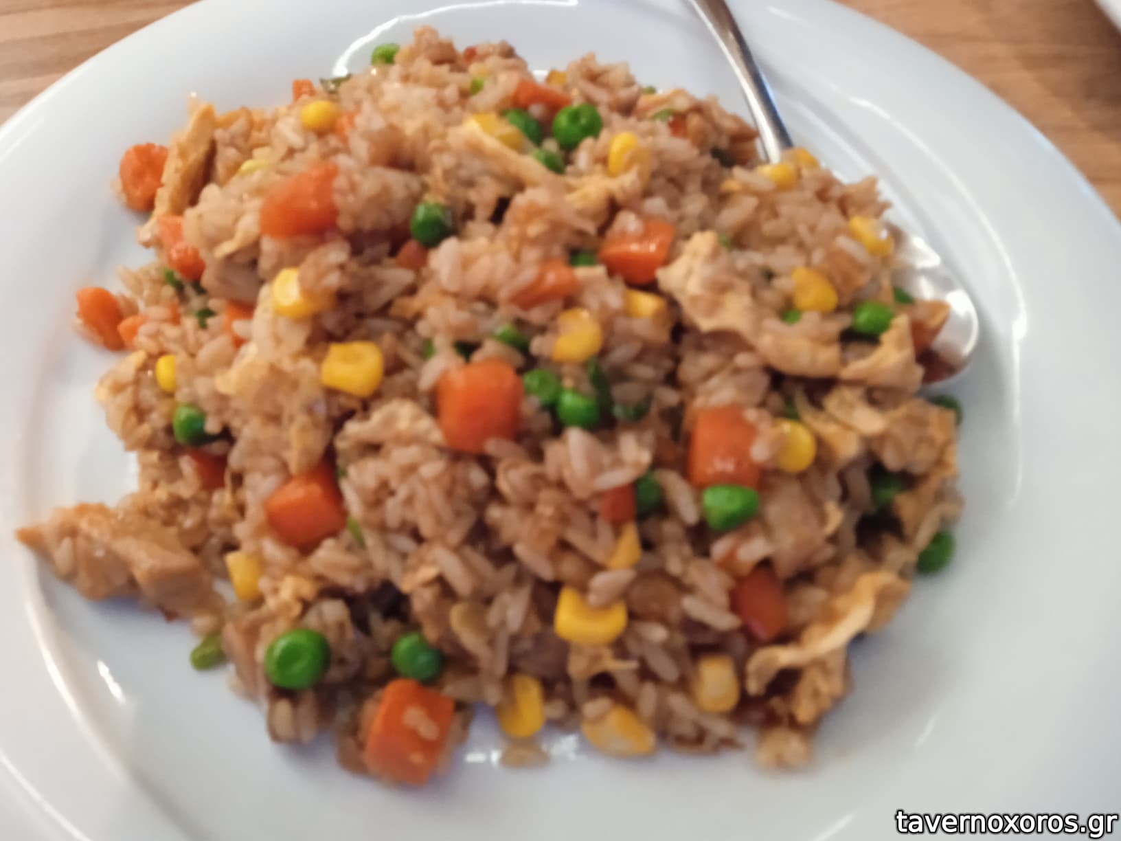 Yangzhou fried rice. Στάνταρ ρύζι, γίνεται με διάφορα χοιρινά, στην εκδοχή τους γίνεται με spam. Μέτριο