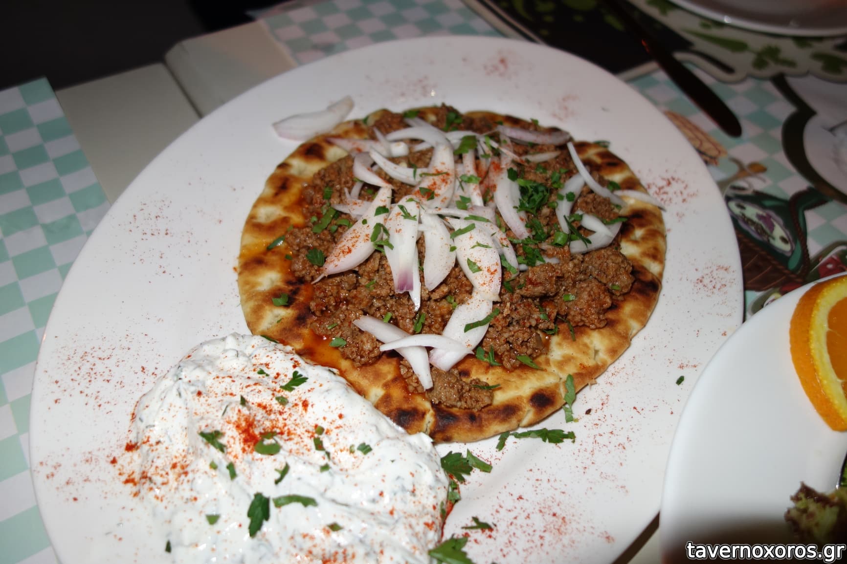 "Λαχματζούν της Μπεμπέκας καυτερό" (κακό, μια πίτα με κιμά από πάνω)