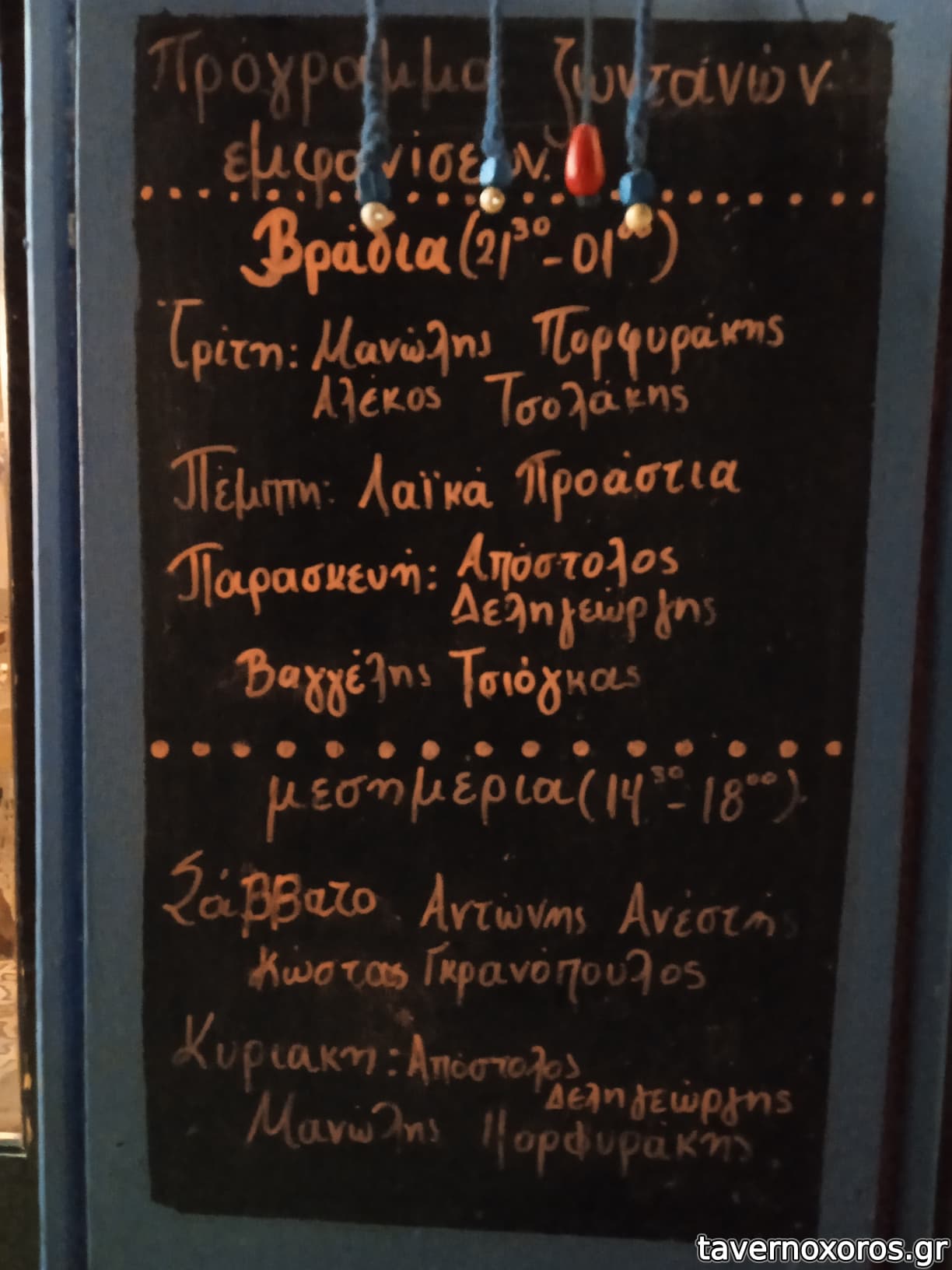 Πρωταγωνιστής εδώ είναι το λάιβ (αν κανονίσεις να το πετύχεις- 2 άντρες μπουζούκι+ κιθάρα και φωνή και οι 2, που αγαπούν αυτό που κάνουν και δημιουργείται εξαιρετική ατμόσφαιρα)