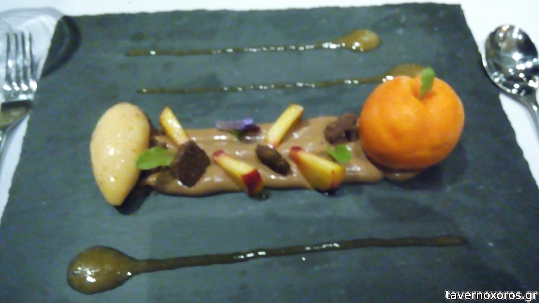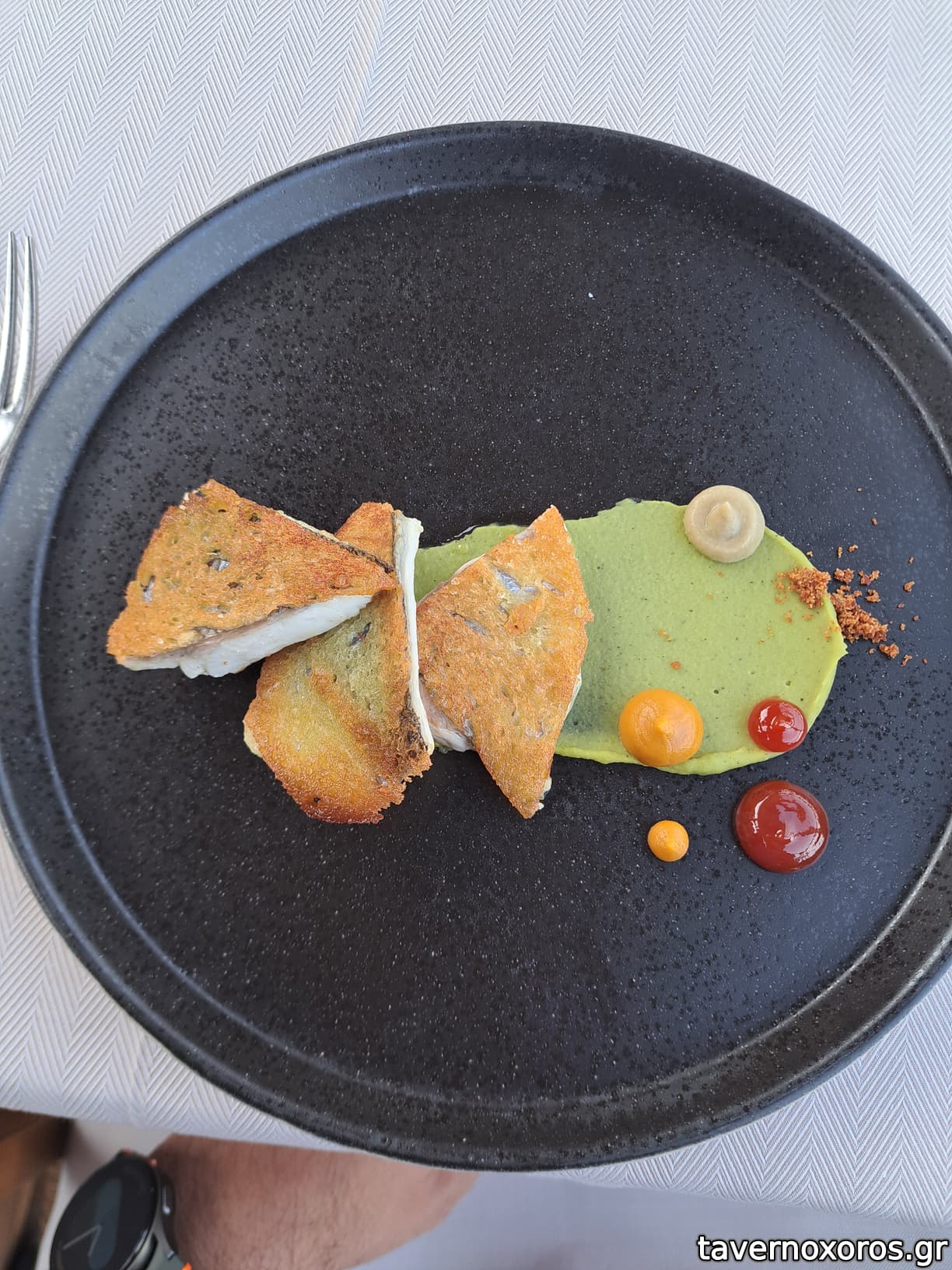 Φιλέτα ψαριού (τσιπούρα σε εμάς) σε λεπτές φέτες ψωμιού με προζύμι, με μους καπνιστής μελιτζάνας και κρέμες ντομάτα – καρότο. Μας είπαν ότι είναι ένα από τα πιο φημισμένα πιάτα τους και καταλάβαμε αμέσως το λόγο. Φανταστική γεύση, υπέροχα μαγειρεμένο ψάρι, απίστευτες οι κρέμες και η μους (ανακατεμένες ύστερα από προτροπή του σεφ)