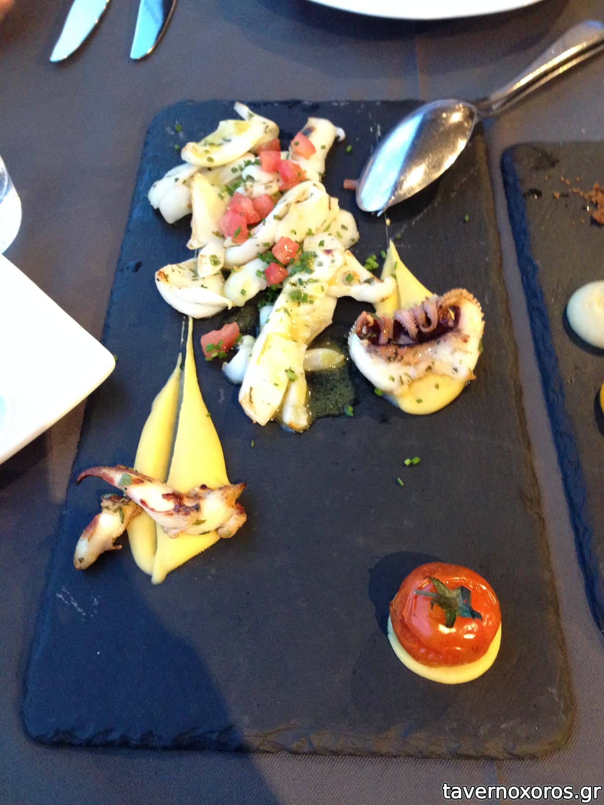 "Καλαμάρι ψητό ελληνικής αλιείας με κρέμα ταραμά, ψητό μαρούλι και ζελέ ούζου"