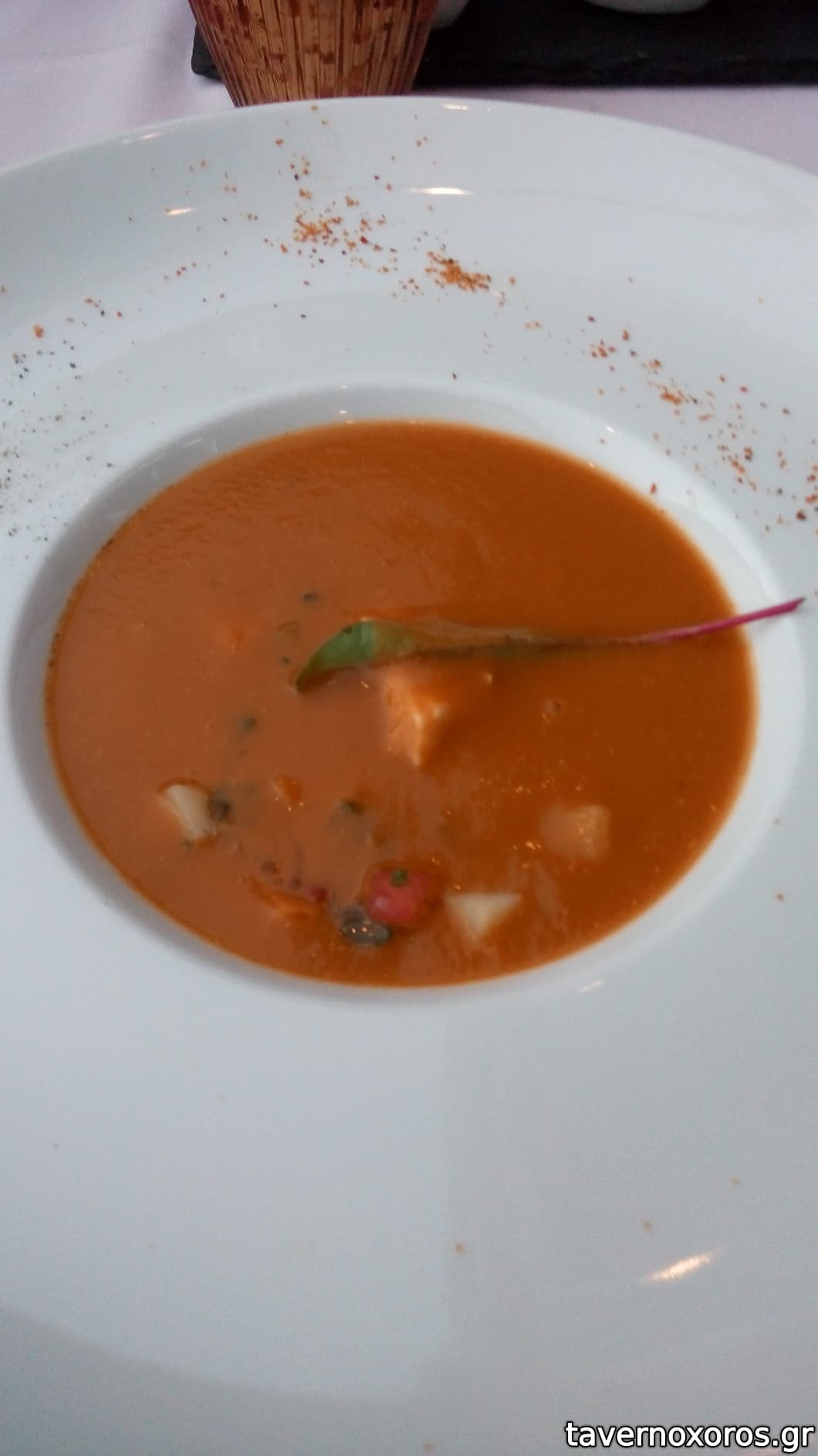 Ψαρόσουπα με φρέσκια ντομάτα, ζωμό από πετρόψαρα και μικρά κομμάτια ψαριού