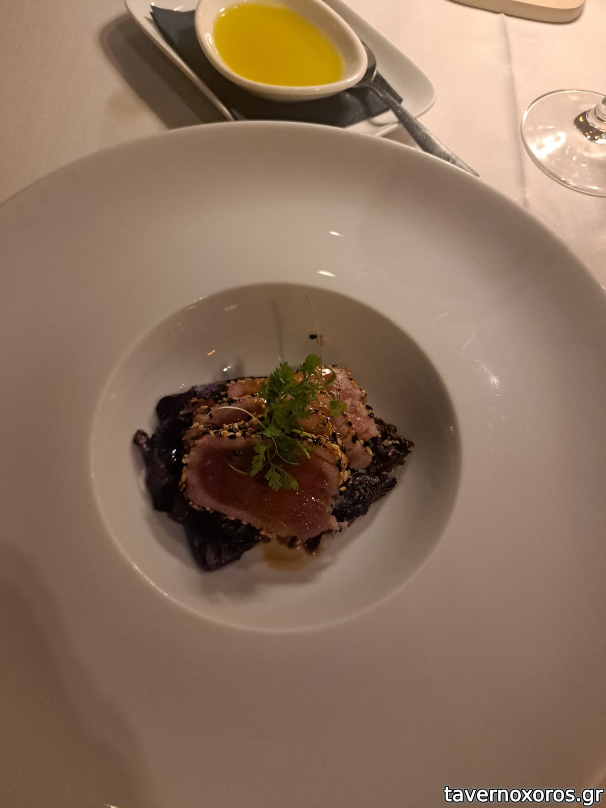 Φέτα σφυρίδα με τσορίθο και ελαιόλαδο αρωματισμένο με σοκολάτα