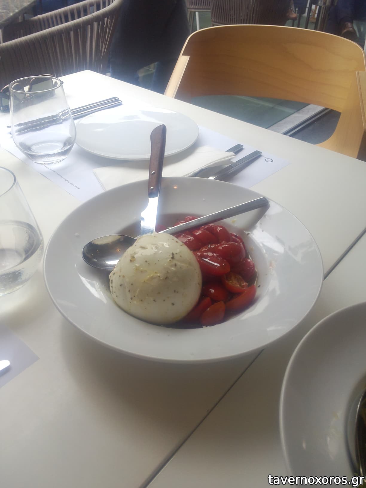 "Μοτσαρέλα από βουβαλίσιο γάλα με ντοματίνια και λάδι βασιλικού" (πολύ καλή)