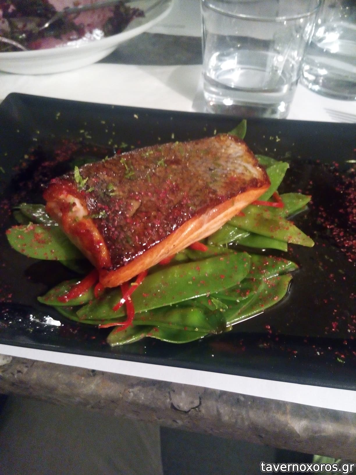 "Τσιπούρα ψημένη πάνω στο αλάτι με τσάτνεϊ από τζίντζερ και κολοκύθι" (αρκετά καλό και το τσάτνεϊ ταιριαστό)
