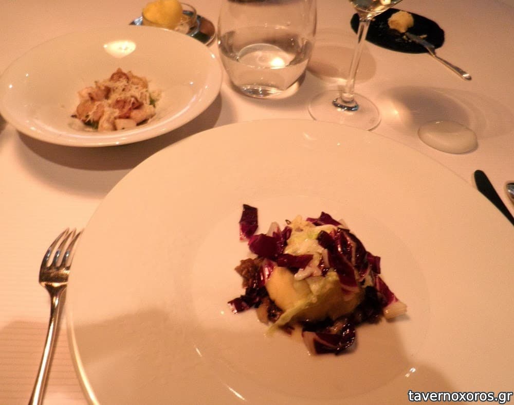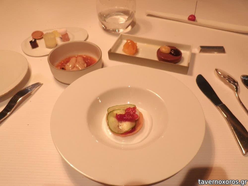 To βουτυρο με lime ηταν καταπληκτικό, τα amuse bouche πολλα κ ιδιαιτερα, με μοριακες επιρροες. Το πρωτο πιατο ενα κομμάτι foie gras απο χήνα με διαφορες παρασκευές για να συνδυαστει. Σε γενικές γραμμες καλό αν κ δεν μου πολυαρέσει το συκώτι. Το δεύτερο καταπληκτικό, ειδικά το σουφλε με την καπνιστη γευση. Κυριος πιατο το κοτόπουλο απο την bresse με το στηθος σε ενα πιάτο, κ το μπουτι σε άλλο. Τα γλυκά πολλά, ταρτα με αγκουρι και ινδοκάρυδο, φασόλια με γλυκόριζα κτλ κ τελος o κορμός των Χριστουγέννων.