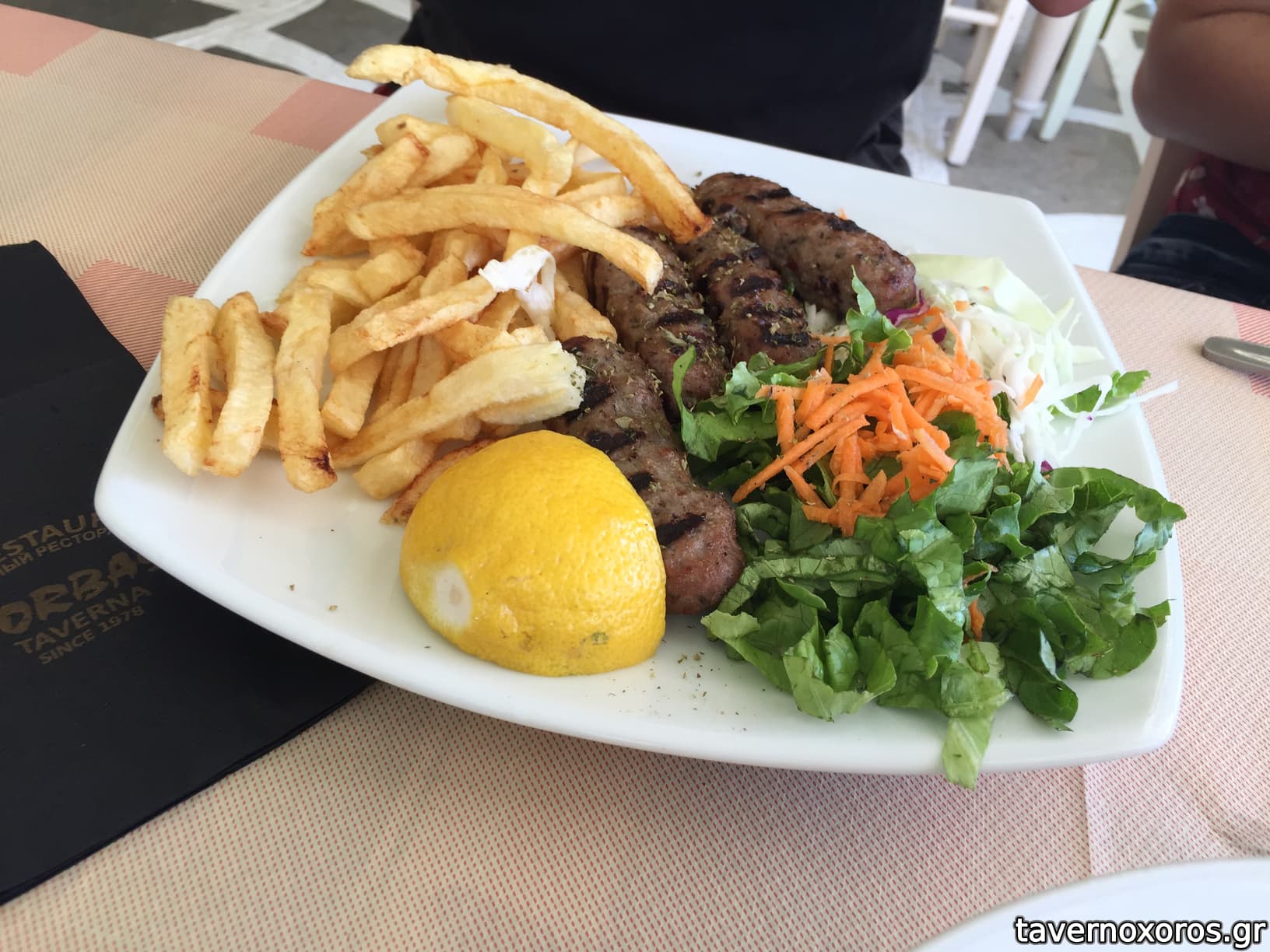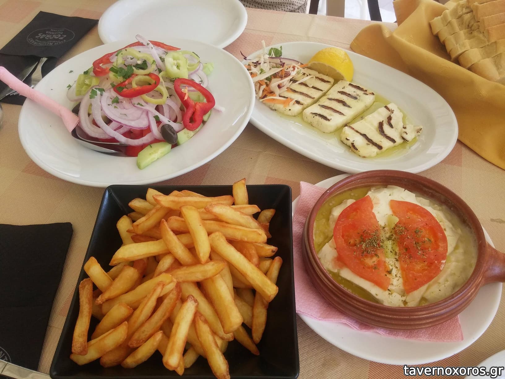 Πατάτες (προκάτ αλλά σε καλό λάδι), αγγουροντομάτα, χαλούμι (τεράστια μερίδα και σε τζάμπα τιμή), μπουγιουρντί (αξίζει απίστευτα για 3.6€)