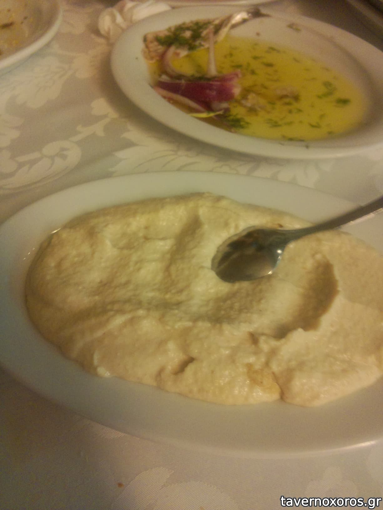 Φαβα: Γαρνιρισμενη με καραμελωμενα κρεμμυδακια και λαδακι. Πολυ καλη και νοστιμη.