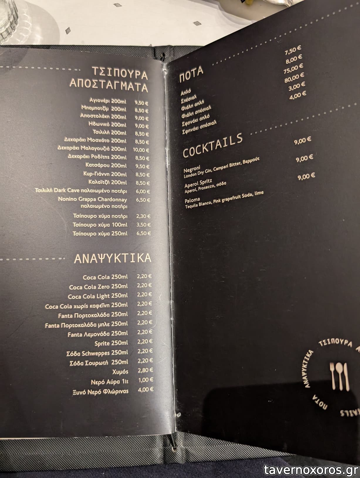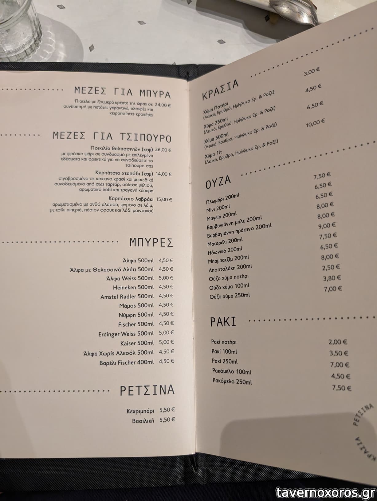 Απο το μενού όλοι οι μεζέδες είναι πολύ καλοί χωρίς δυσάρεστες εκπλήξεις- με δυνατό σημείο μεζέδες με θαλασσινά, έχει δυνατή ποικιλία σε τυριά κ η κάβα του είναι πολύ ενημερωμένη τόσο σε μπύρες (έχει 2-3 βαρέλι κ αρκετές ετικέτες) όσο κ σε τσίπουρο-κρασί.