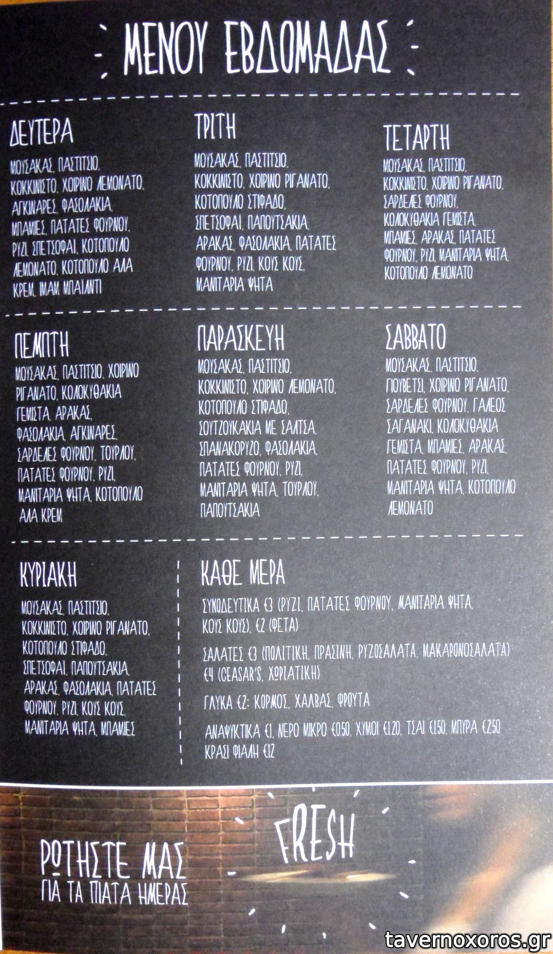 Ήταν ένα πολύ καλό και καθαρό μαγειρείο. Σου έδιναν ένα πολύ μεγάλο πιάτο, διάλεγες από τα ταψιά που έβλεπες τι θέλεις να σου βάλουν (π.χ. χοιρινό λεμονάτο, σουτζουκάκια σμυρνέικα, μουσακά, σουφλέ ζυμαρικών, παπουτσάκια, γεμιστά, κότσι, κοτόπουλο ψητό, ψάρι πλακί κ.ά.), μετά διάλεγες γαρνιτούρα (π.χ. πατάτες φούρνου ή πιλάφι) και τέλος συμπλήρωνες στο πιάτο σου ό,τι και όση σαλάτα ήθελες. Διάλεγες και το ψωμί της αρεσκείας σου (άσπρο - μαύρο) παίρνοντας όσες φέτες ήθελες. Και για όλα αυτά πλήρωνες το αστείο ποσό των 7,00 €.