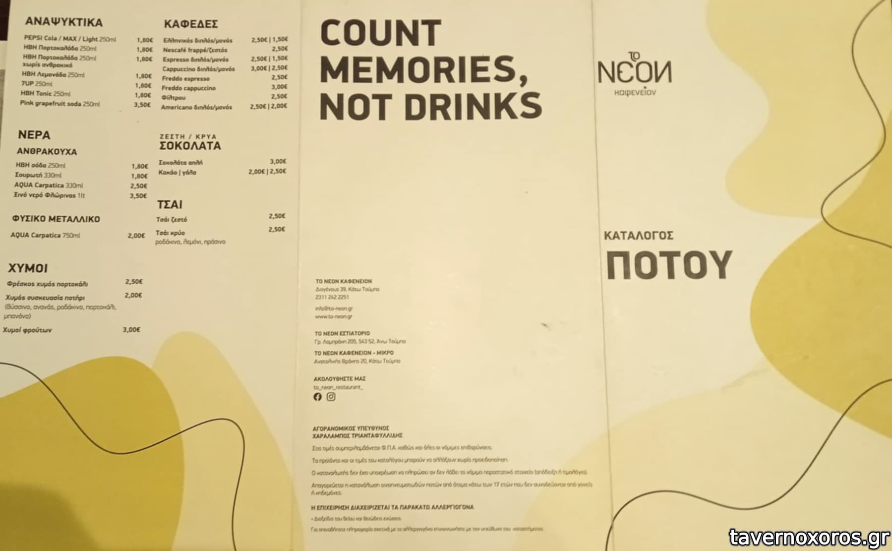 | Λέξεις κλειδιά | #cafe-bar, #εξωτερική θερμάστρα, #tv, #ντολμαδάκια, #μανιτάρια, #κολοκυθοκεφτέδες, #φάβα, #ντοματοκεφτέδες, #ομελέτα, #μπάτζος, #μαστέλο, #χαλούμι, #κομός, #κολοκυθάκια, #φασόλια γίγαντες, #γαύρος μαρινάτος, #χέλι καπνιστό, #γαρίδες, #μύδια, #σαρδέλα, #γαύρος, #χταπόδι, #σολομός, #ζυμαρικά, #ριζότο, #burgers, #μπιφτέκι, #συκώτι, #σουτζουκάκια, #κεφτεδάκια, #πανσετομπριζόλα, #κοπές, #τηγανιά, #παϊδάκια, #ψαρονέφρι, #συκωταριά, #πάπρικα, #λουκάνικο, #steaks |