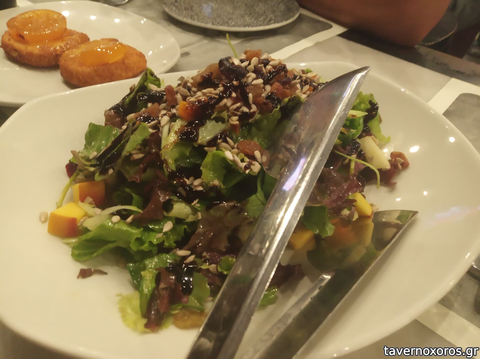 Σαλάτα Νέον με ρόκα, μαρούλι, μπαλσάμικο, φρέσκα φρούτα κλπ.