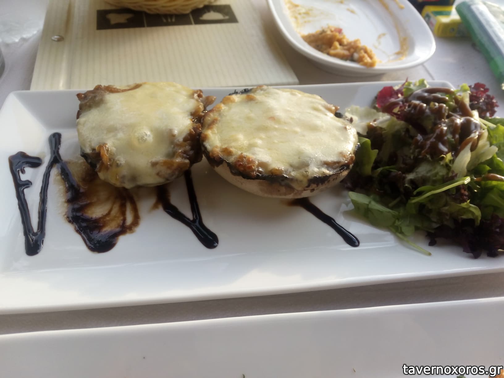 Πόρτο Μπέλο γεμιστό με καραμελωμένα κρεμμύσια και καπνιστό τυρί (καλά, αλλά το τυρί τύπου πίτσας περιττό)
