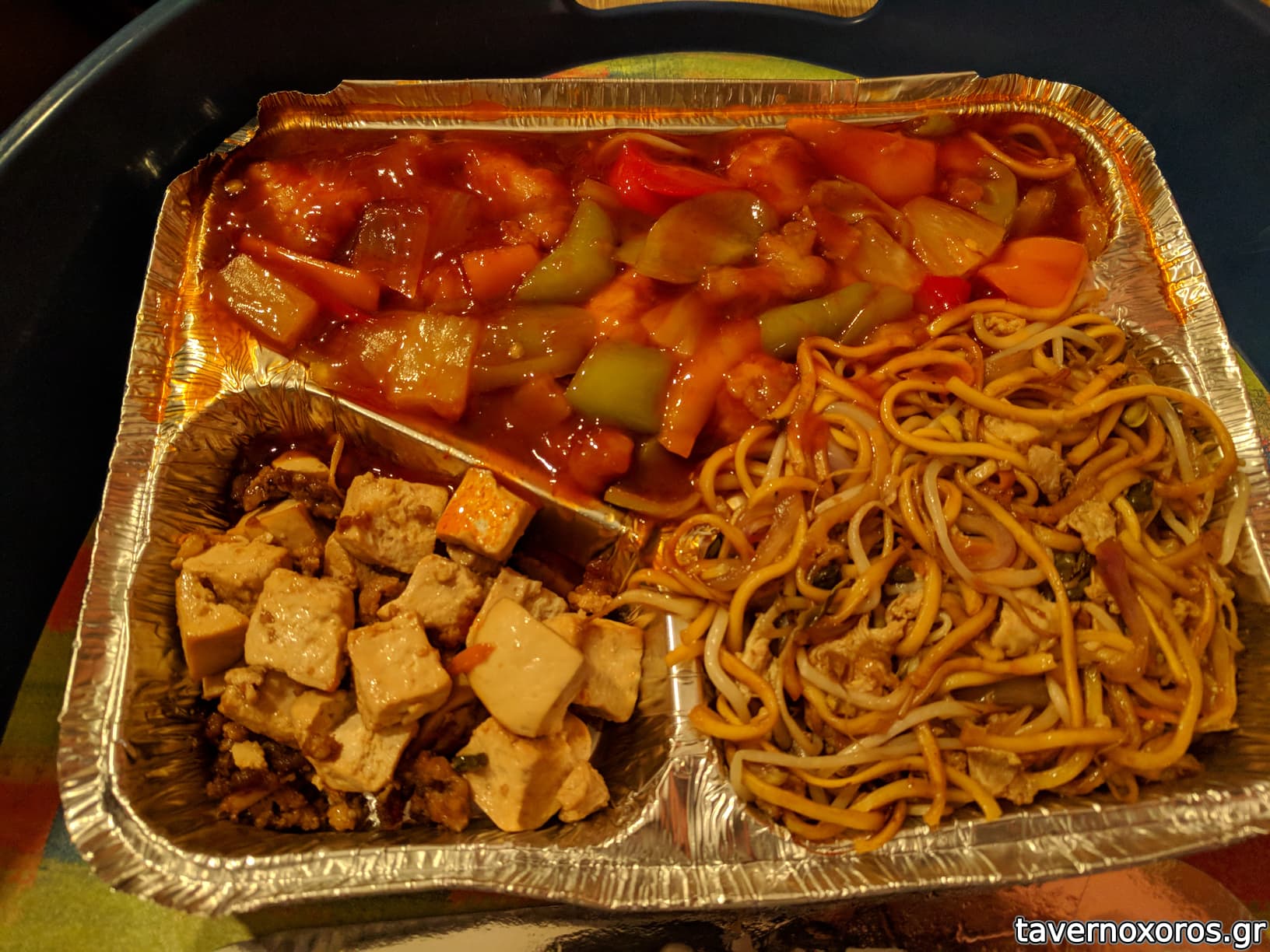 Γλυκόξινο κοτόπουλο, τυρί από σόγια τηγανητό με κιμά, noodles