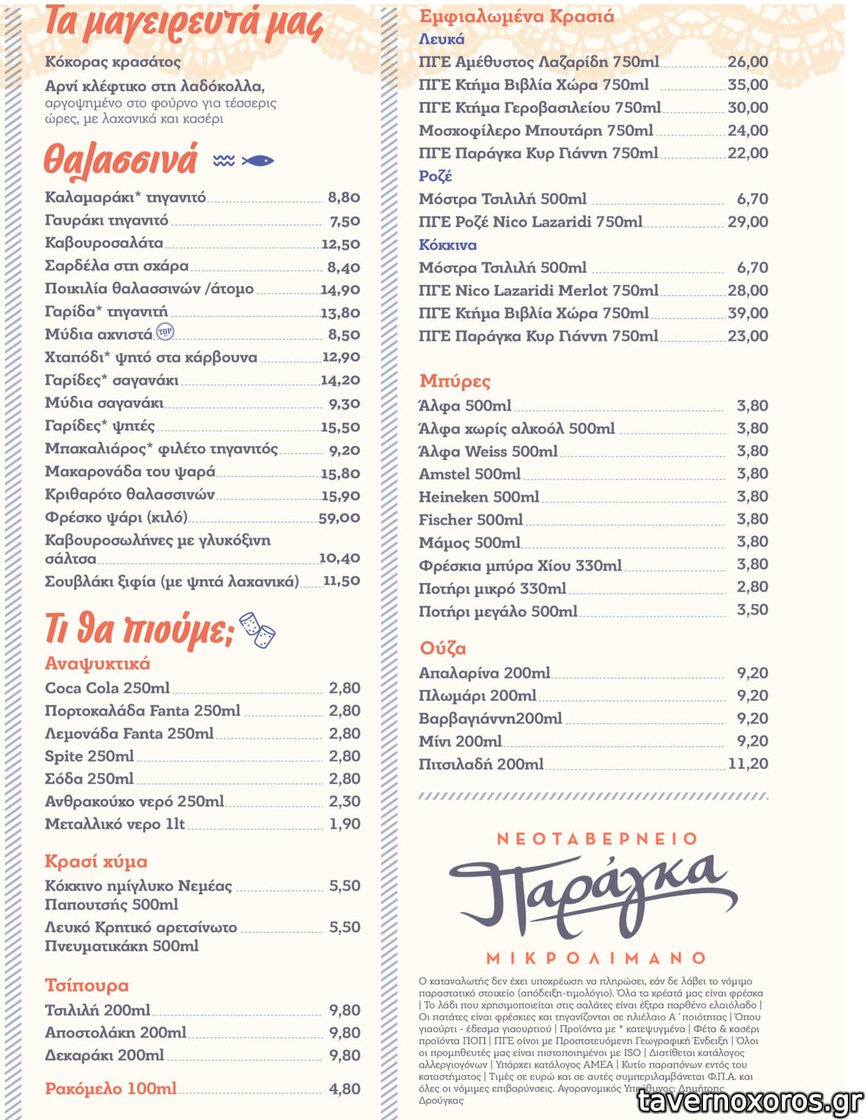 | Λέξεις κλειδιά | Paragka, Paraga, #ντάκος, #μαστέλο, #κεφτεδάκια, #μανιτάρια, #κοντοσούβλι, #σουβλάκια, #σουτζουκάκια, #πανσέτα, #παϊδάκια, #τηγανιά, #κότσι, #αρνάκι στο φούρνο, #κόκορας κρασάτος, #χταπόδι, #καβουροσαλάτα, #σαρδέλα, #μύδια, #γαρίδες, #μπακαλιάρος σκορδαλιά |