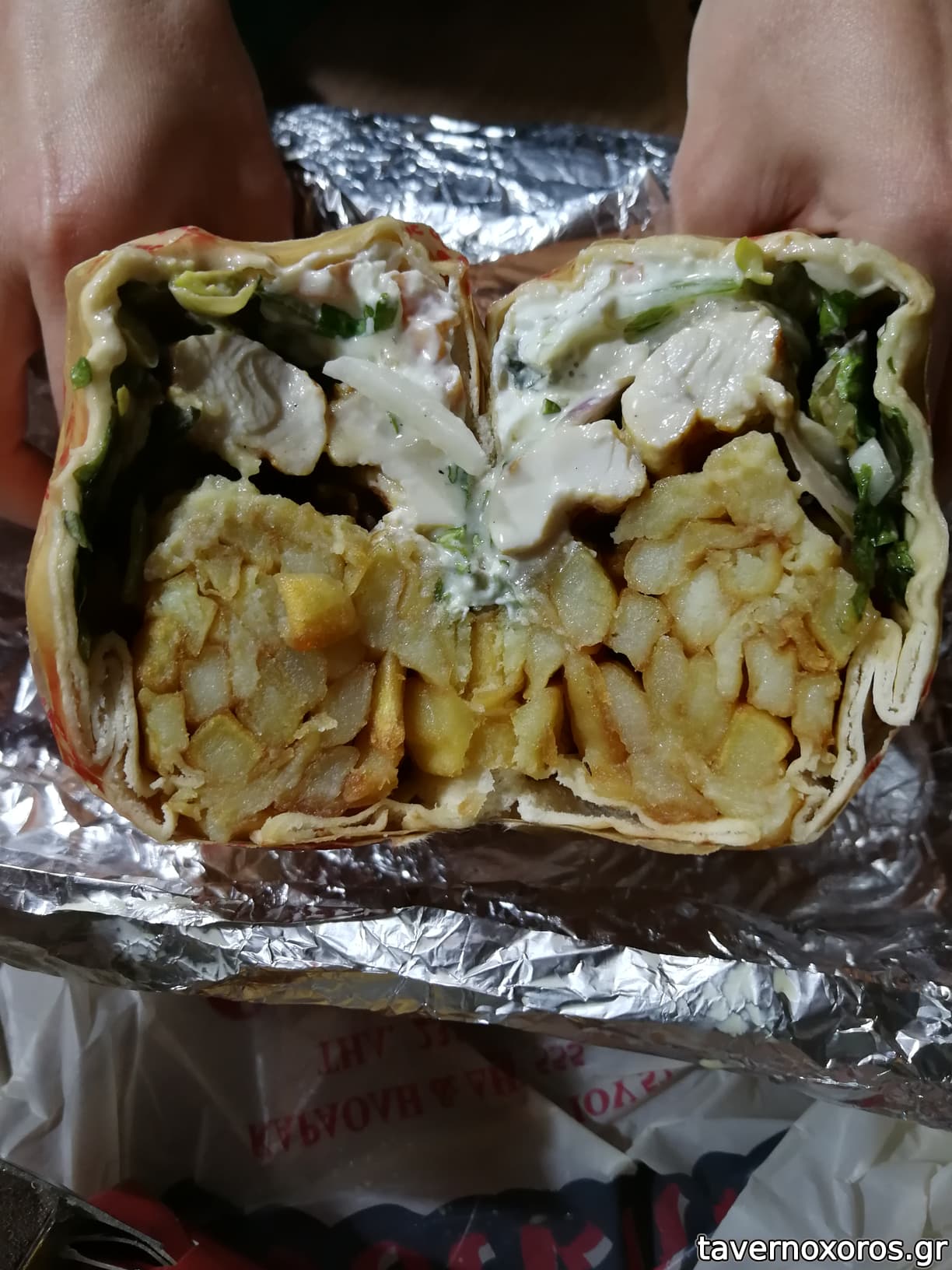 με αραβική πίτα, τυλιγμένο σε εναν κύλινδρο κομμένο στα 2, ότι πρεπει για να φας χωρις να σταχτείς ολούθε.