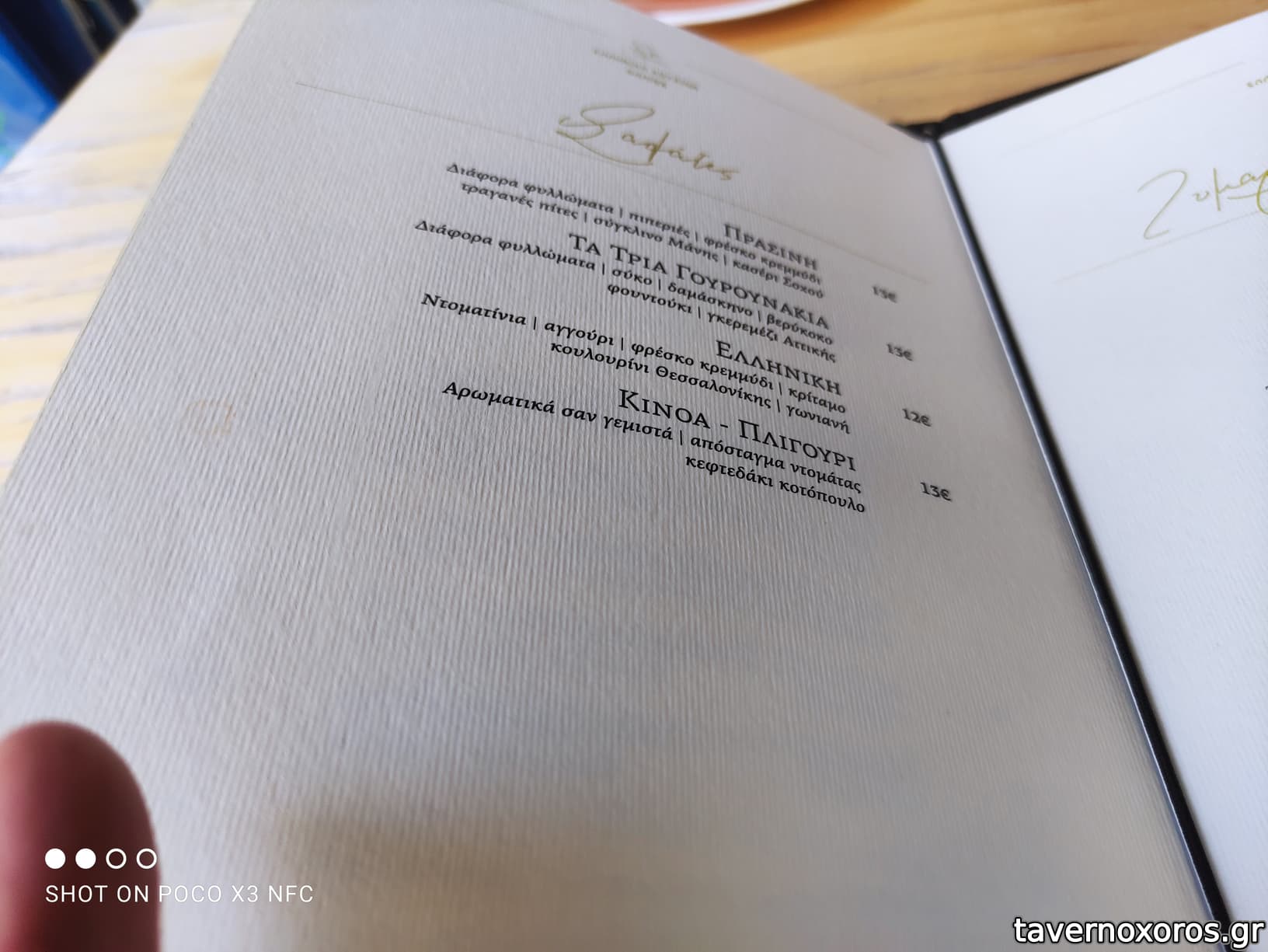 ΑΠΟ ΟΡΕΚΤΙΚΑ: Το μαστέλο σε φύλλο κανταϊφιού χανόταν μέσα στα φύλλα και δε γευόσουν καθόλου το τυρί. Ταλαγάνι σε κομματάκια με σύκα ήταν μέτριο και πολύ αλμυρό. Τα ψητά λαχανικά ήταν καλά και το συνοδευτικό χαλούμι ήταν αρκετά νόστιμο και ωραία ψημένο. Οι τηγανητές πατάτες ήταν φρέσκιες και νόστιμες.