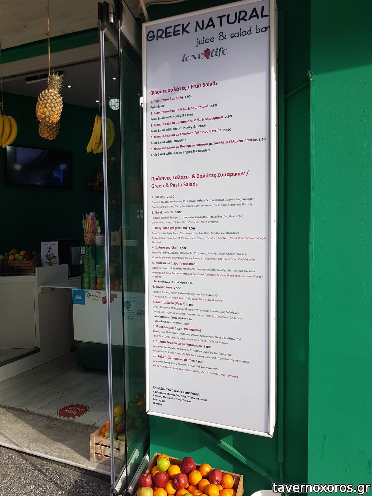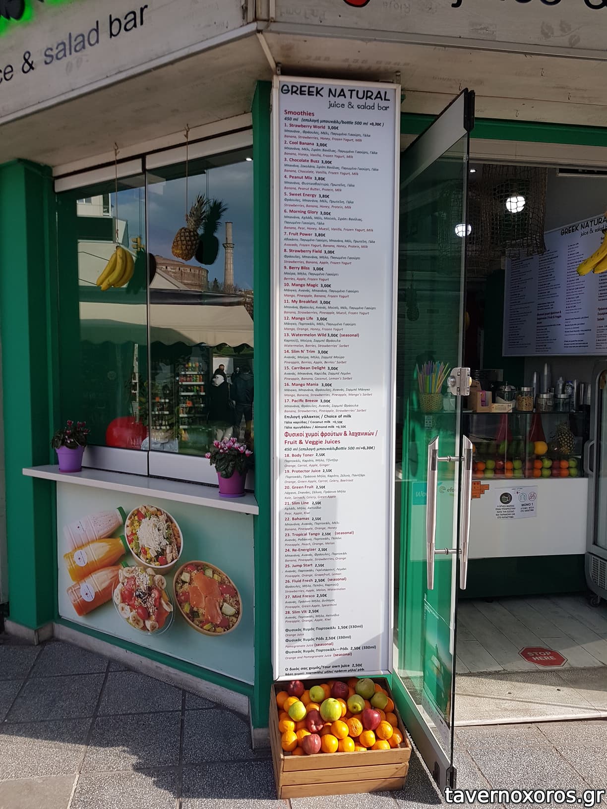 Πέρασα Μάρτιο 2021. Εξυπηρετικός ο ιδιοκτήτης. Έχει μόνο χυμούς, φρουτοσαλάτες και σαλάτες. Δοκίμασα σαλάτα, τιμές χαμηλές (π.χ. 2,5 με 3€ η σαλάτα), αλλά και με αντίστοιχα υλικά για κρατηθεί χαμηλά το κόστος (π.χ. τα τυριά "φέτα" και "μοτσαρέλα" δεν ήταν κανονικά). Όχι του γούστου μου, αλλά είναι μια αποδεκτή επιλογή για φθηνή φοιτητική σαλάτα.
