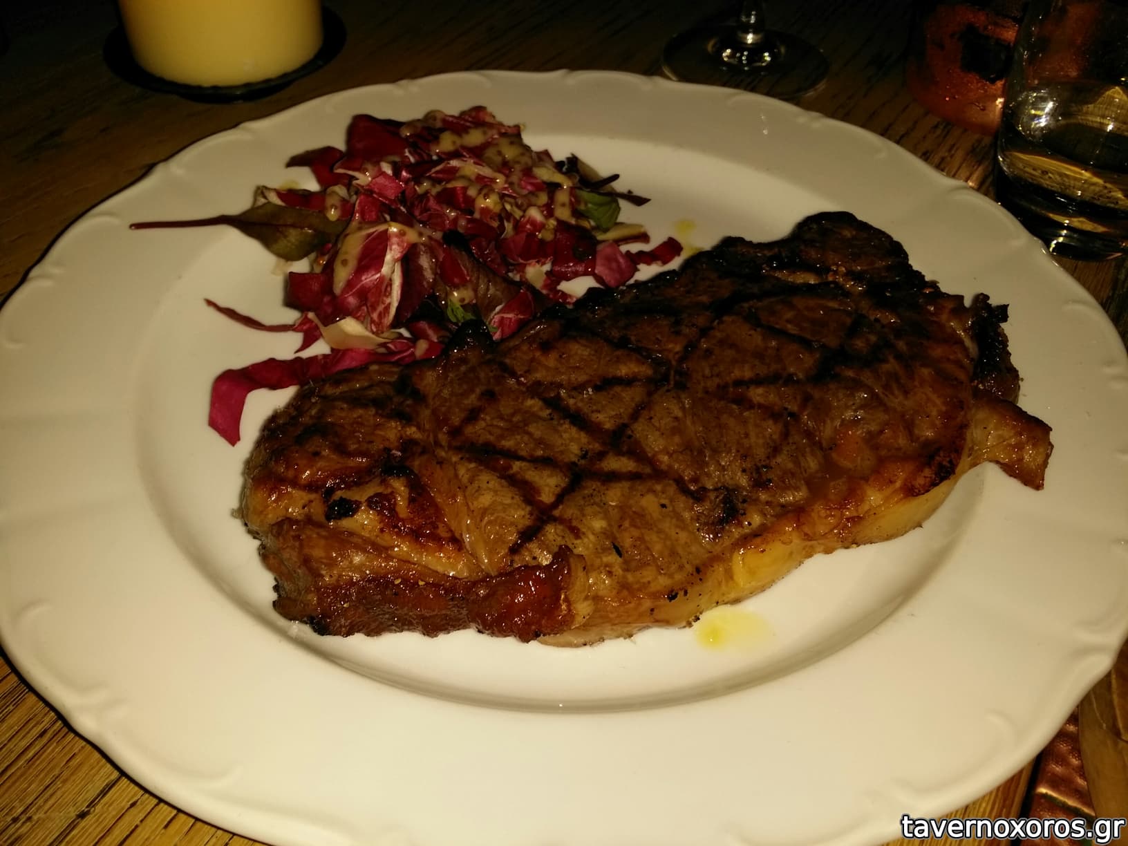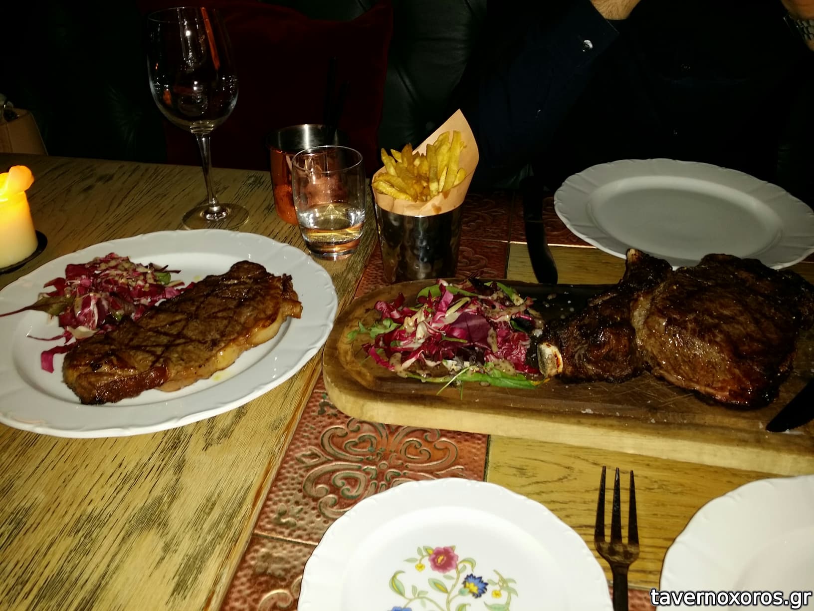Το φαγητό του ήταν αξιοπρεπές , κινείτει σε Ιταλική-Μεσογειακή κουζίνα. Εμείς προτιμήσαμε να πάμε σε καθαρή κρεατοφαγία επιλέγοντας ένα veal rib του κιλού (115 ευρω) το οποίο ψήθηκε όχι ακριβώς όπως θέλαμε, και ένα sirloin (new york strip) των 400gr στα 65euros που ήταν λουκούμι. Είχε συνοδευτικά τα οποία δεν μας τρέλαναν. Τα επιδόρπια επίσης μέτρια.
