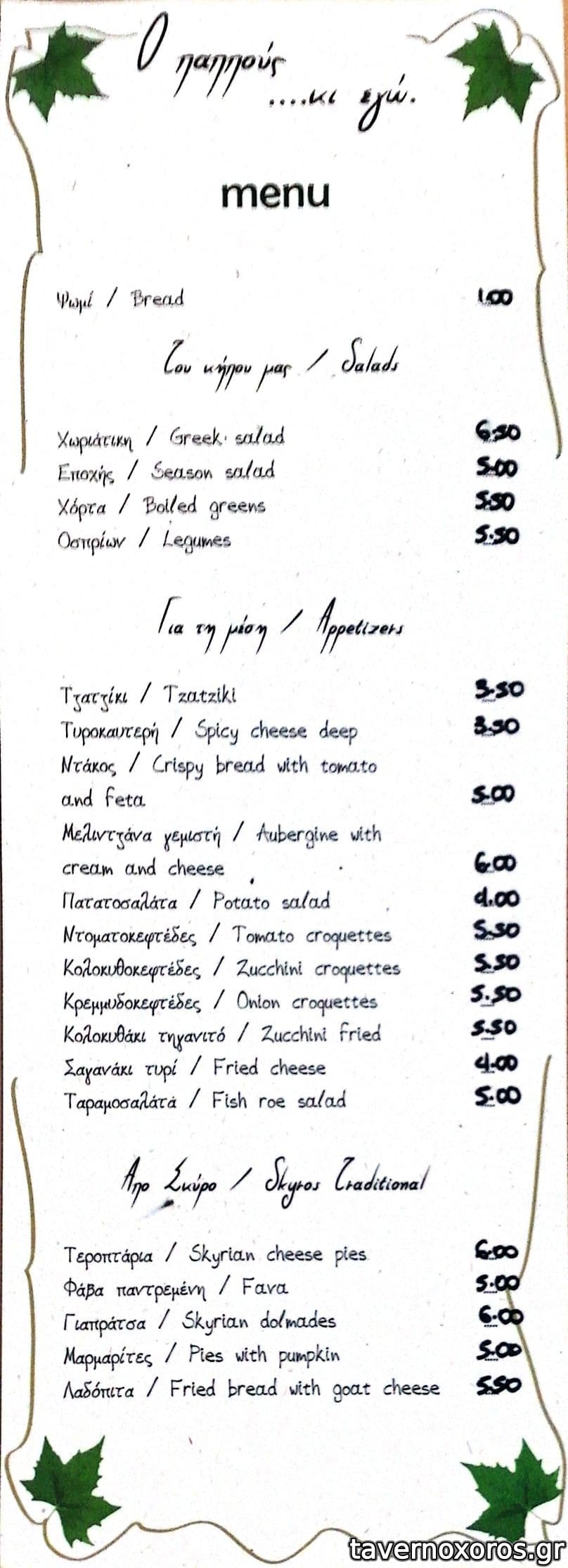 Η καλύτερη επιλογή στην Χώρα της Σκύρου με διαφορά! Ύστερα από μια βδομάδα στην Σκύρο μπορώ να πω ήταν οι πιο σωστοί επαγγελματίες που δεν κοιτάνε τον τουρίστα με μισό μάτι (απογοητεύτηκα από την συμπεριφορά άλλων καταστημάτων). Πολύ ωραία ατμόσφαιρα, καλή μουσική, ενδιαφέροντα και νόστιμα φαγητά σε σχετικά λογικές τιμές. Έχει επίσης συγκεντρωμένα στον κατάλογο τις σπεσιαλιτέ του νησιού: φάβα, λαδόπιτα με τυρί σακούλας, σουπιές με μάραθο, "
