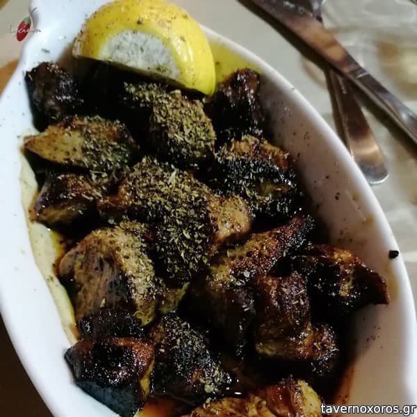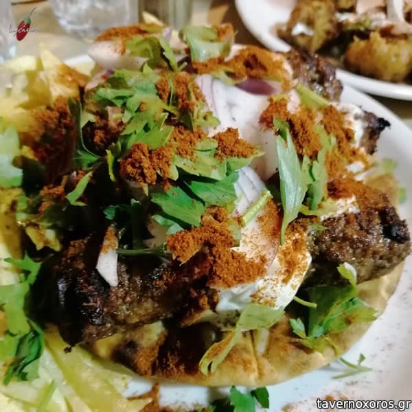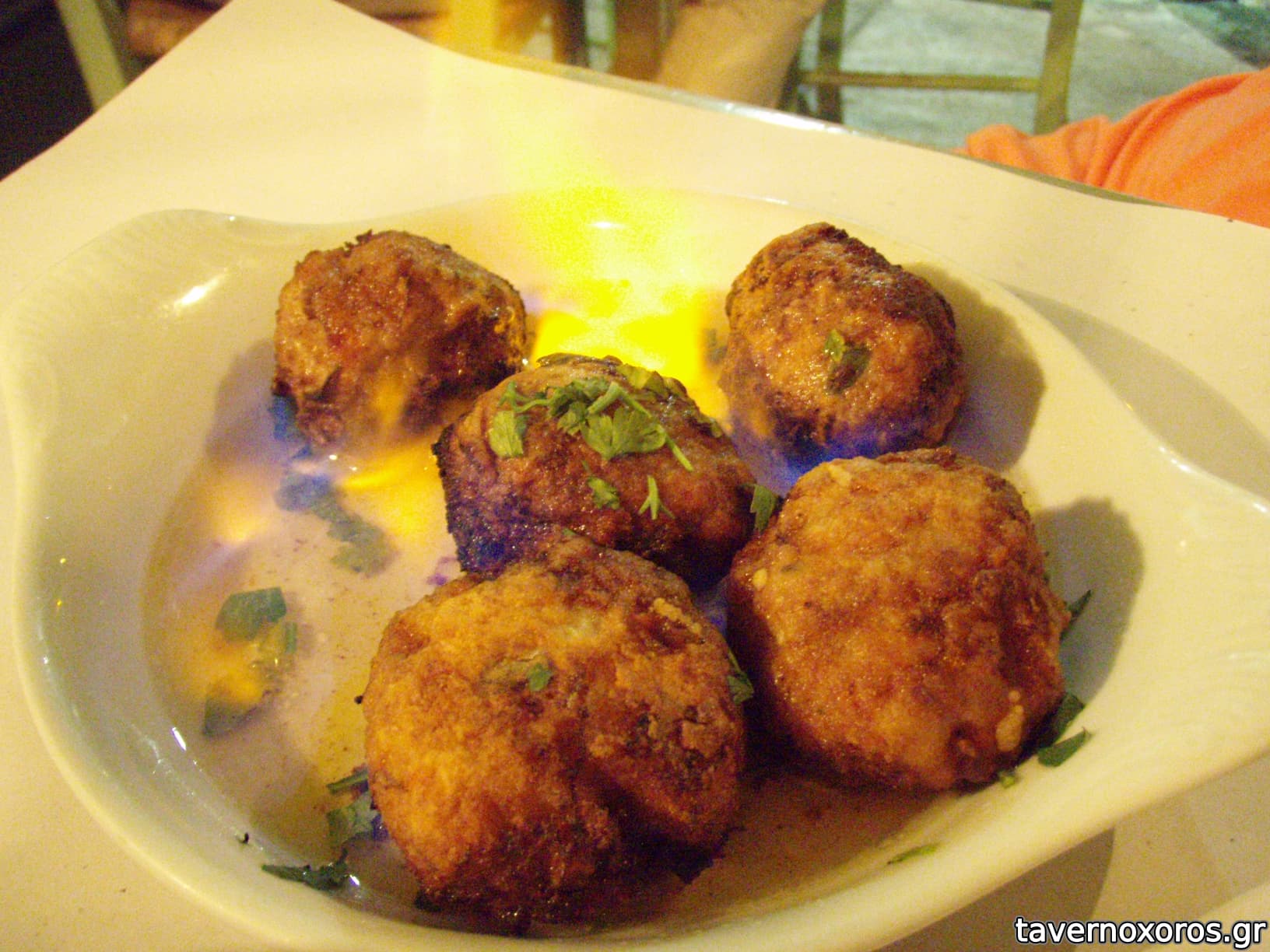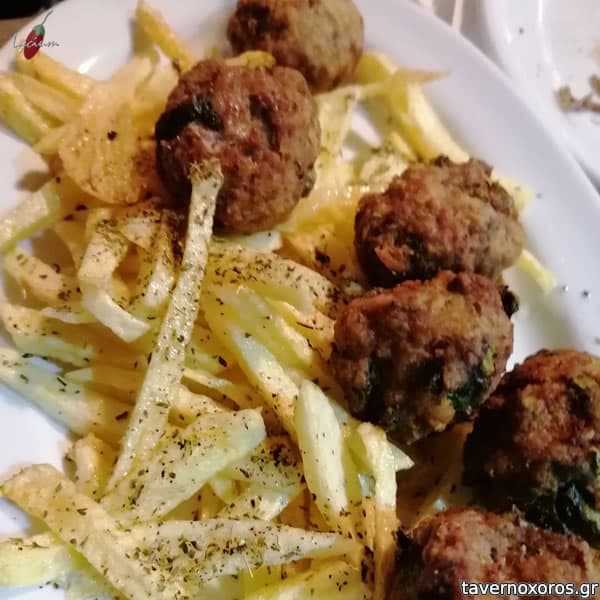 Κεφτεδάκια ούζου (στα φέρνουν βουτυγμένα σε φλεγόμενο ούζο, πράγμα που τους δίνει μια ωραία γεύση γλυκάνισου)