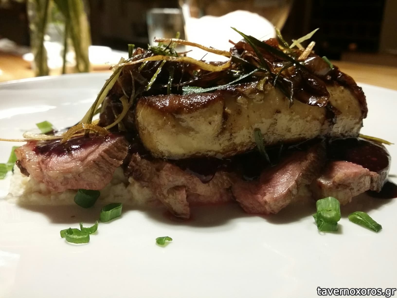 "Seared Duck breast, foie gras, black currant sauce" (οκ σαν σύνολο)