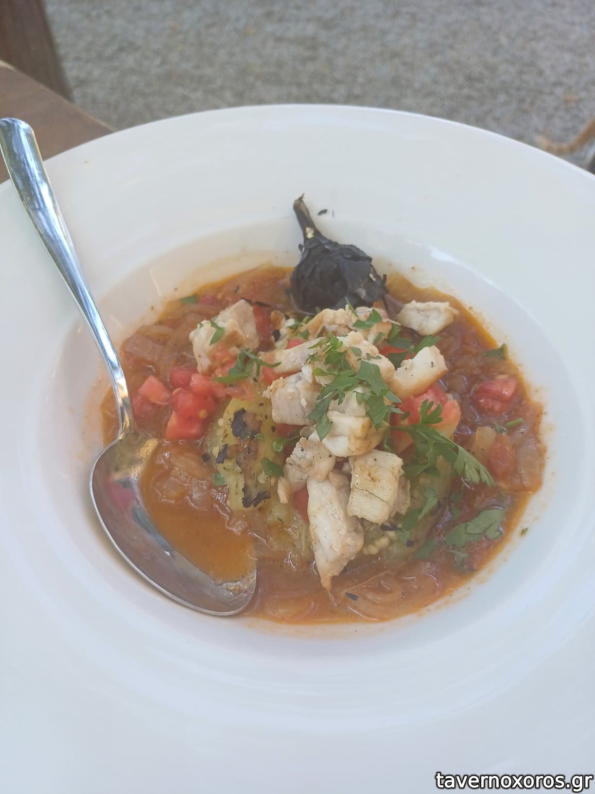 Μελιτζάνα, ντομάτα, ζωμός ψαριού, ξιφίας σωτέ (πολύ καλό)