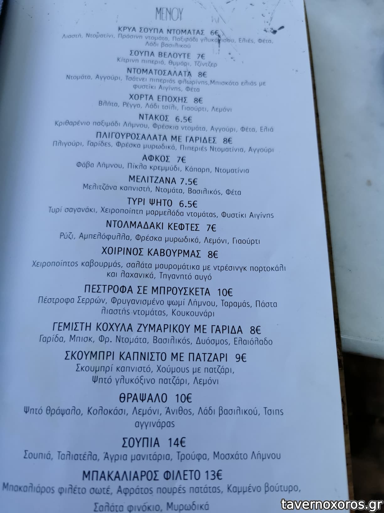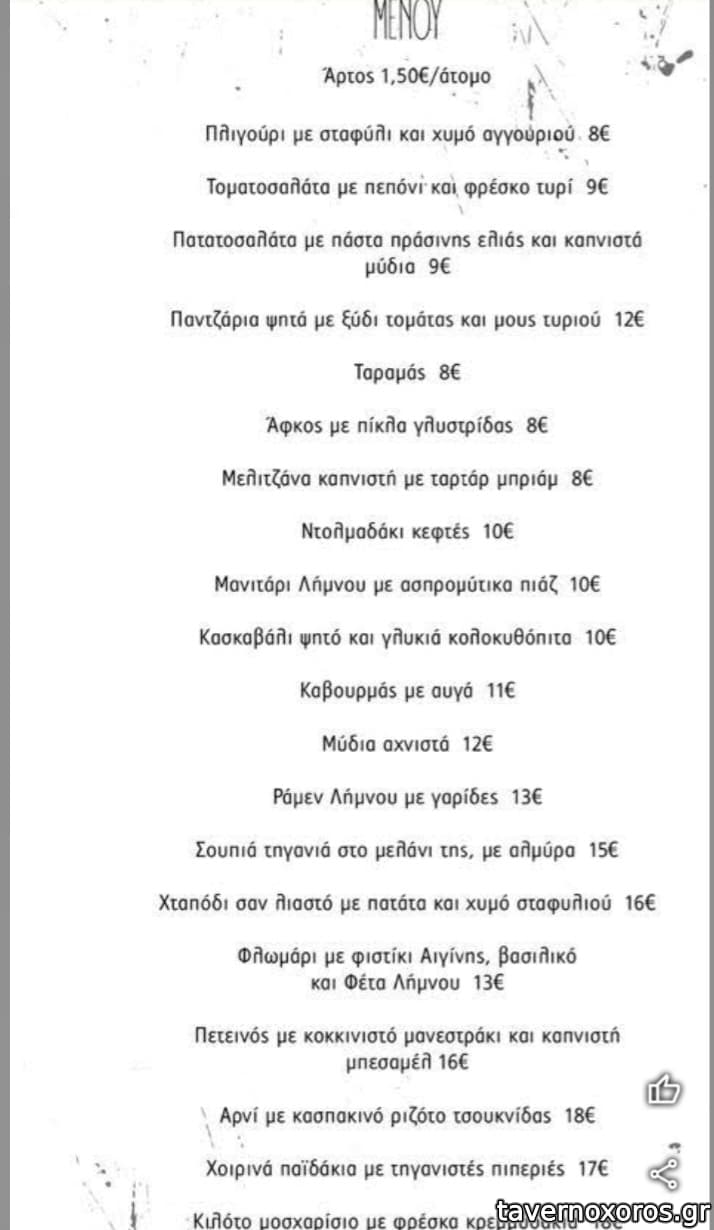 Με 1 λίτρο λευκό Χατζηγεωργίου (καλό) και 1 ποτήρι παλαιωμένο τσίπουρο Λήμνου δώσαμε 70€. Αναμφισβήτητα η καλύτερη γευστική εμπειρία που είχαμε στο νησί. Προτείνεται ξεκάθαρα!