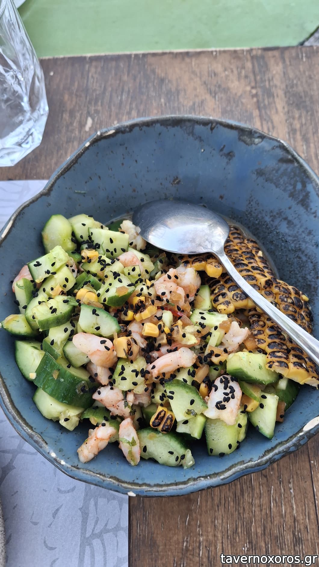 Κολοκυθάκι αχνιστό, γαριδάκι Λήμνου, ανθότυρο, μυρωδικά (πολύ νόστιμο)