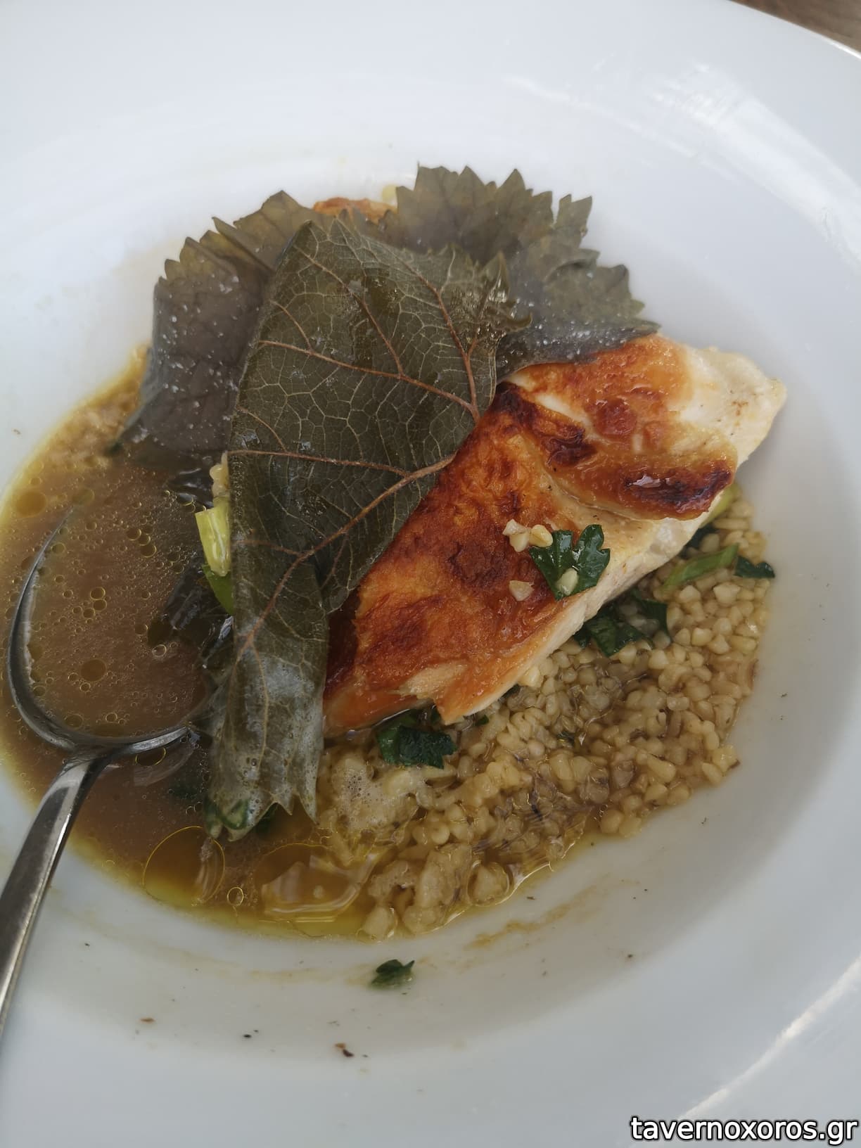 Κόκορας, πλιγούρι, μανιτάρια, αφρός κοτόσουπας με καλαμπόκι, αμπελόφυλλο (αδιάφορο)