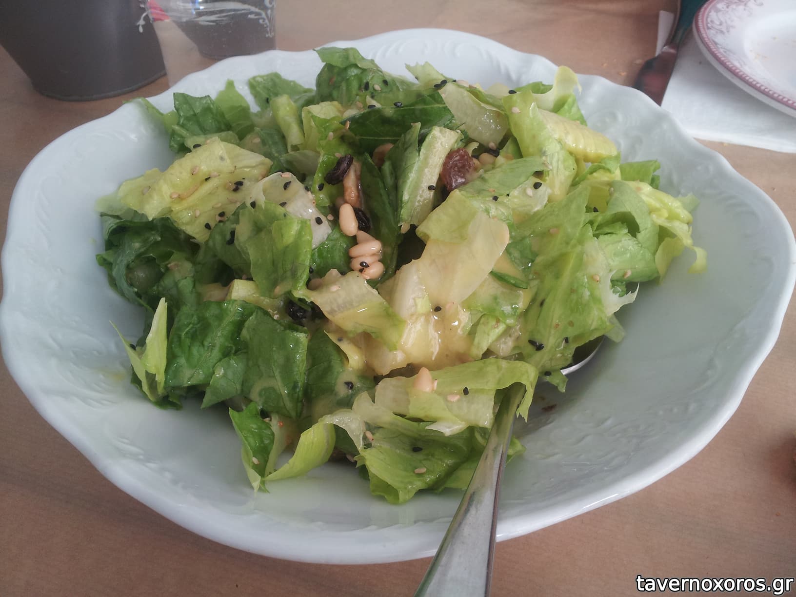 "Ενδοχώρα με μαρούλι, καρύδια, σύκα, σταφίδες, κουκουνάρι και βινεγκρέτ με μηλόξυδο"