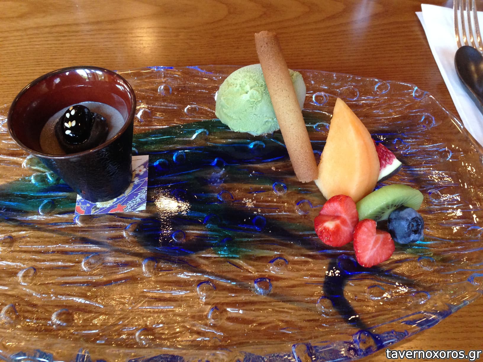 Το γλυκό πουτιγκα απο μαυρο σουσαμι, με φρουτα (επισης εξαιρετικα) και παγωτο ματσα ήταν απλα οκ.