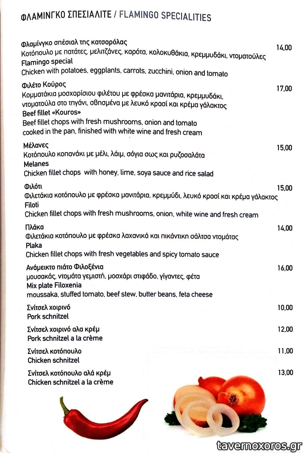 | Λέξεις κλειδιά | Φλαμίγκο, Φλαμίνγκο, #ταράτσα, #θέα, #πεζόδρομος, #παιδικό μενού, #χταπόδι, #γαρίδες, #μύδια, #σολομός, #τόνος, #ντάκος, #ντολμαδάκια, #μελιτζάνα τηγανητή, #κολοκυθάκια, #πιπεριές, #φασόλια γίγαντες, #μανιτάρια, #φάβα, #κολοκυθοκεφτέδες, #χαλούμι, #κεφτεδάκια, #ξινομυζήθρα, #μουσακάς, #παστίτσιο, #αρνάκι στο φούρνο, #κλέφτικο, #κατσίκι λεμονάτο, #στιφάδο, #κατσικάκι κοκκινιστό, #κατσικομακαρονάδα, #κοτόπουλο, #σνίτσελ, #μοσχαράκι λεμονάτο, #σουβλάκι, #μπιφτέκι, #λουκάνικο, #μπιφτέκι γεμιστό, #χοιρινή, #μοσχαρίσια μπριζόλα, #παϊδάκια, #ψαρονέφρι, #steaks |