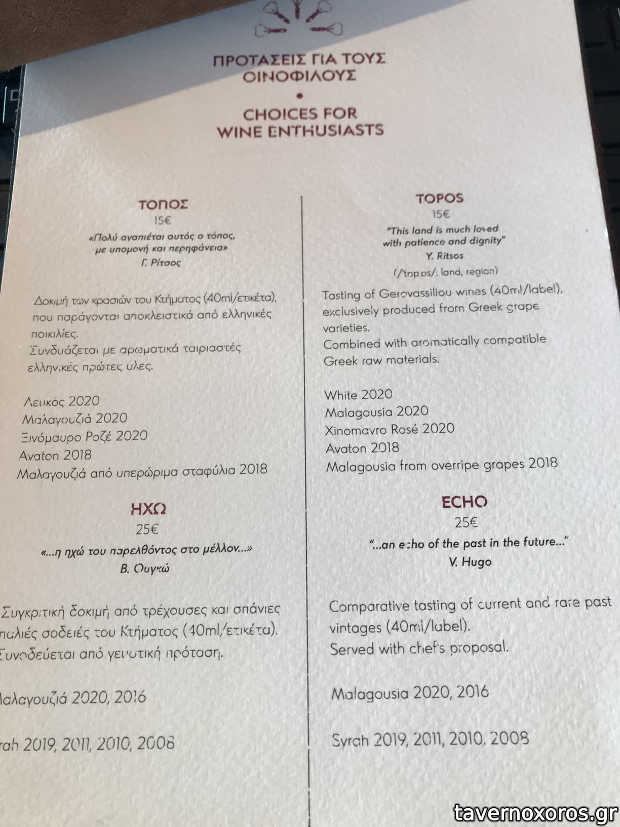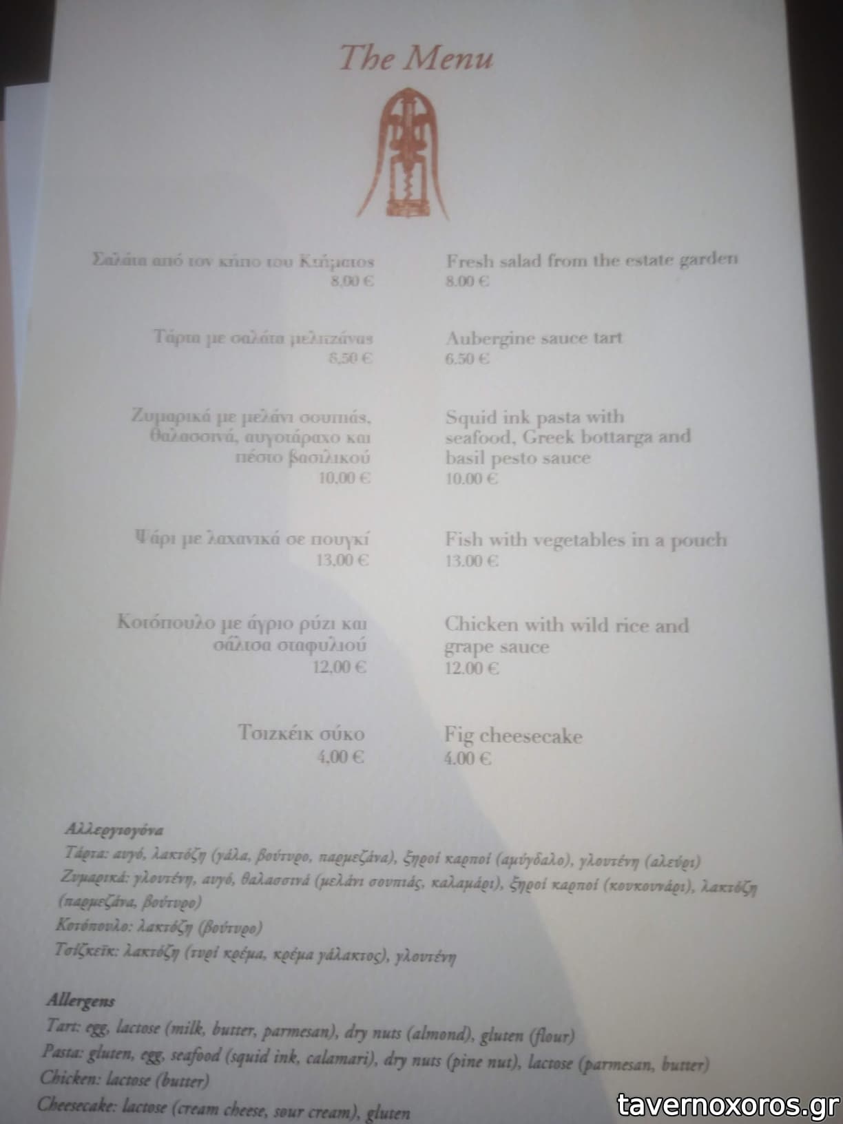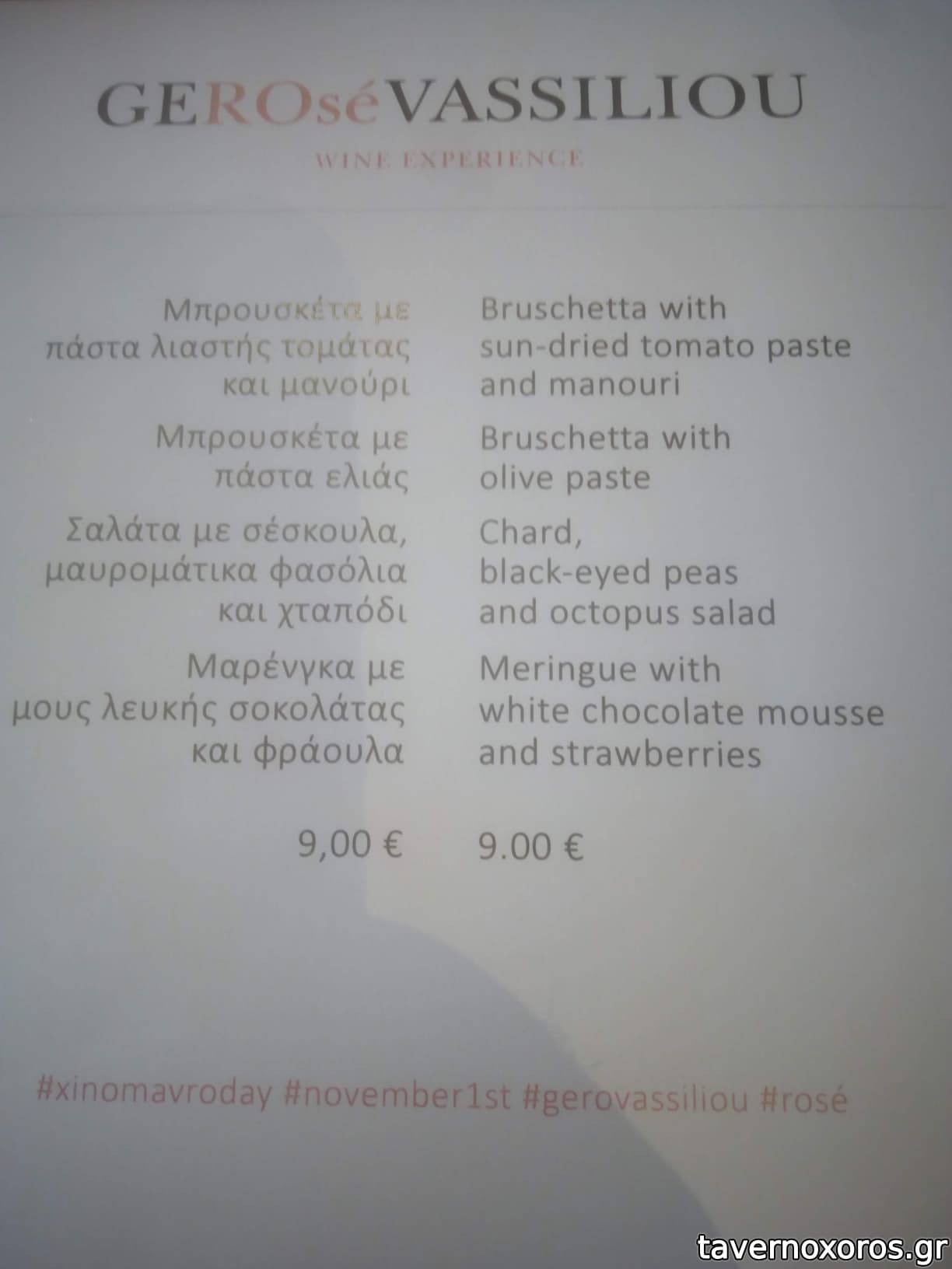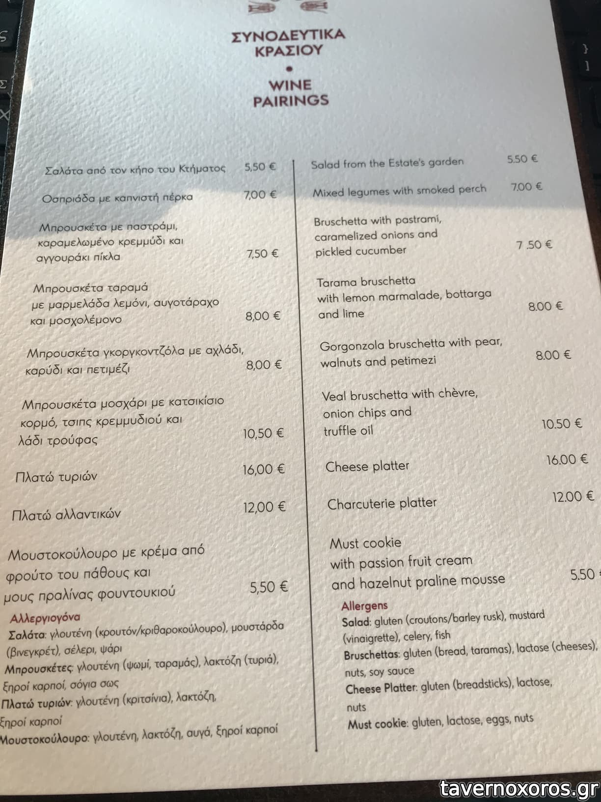 Δοκιμή Λευκών/Ροζέ 6 ποτήρια και δοκιμή Ερυθρών 4 ποτήρια. Μαζί πήραμε και μια Τάρτα με Σαλάτα Μελιτζάνας. Για τα παιδιά μάς έφεραν κάποια παζλ για να απασχολούνται (φιλικοί για παιδιά, αν και ΔΕΝ σε προδιαθέτει ο χώρος, μπράβο τους).