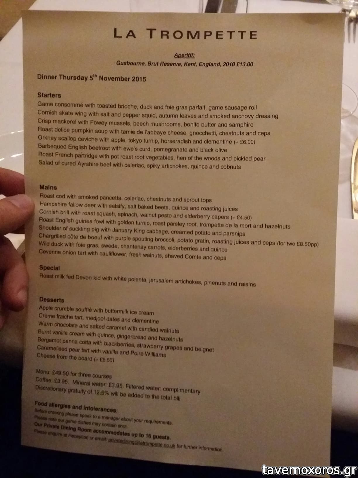 Φαγητό: πάρα πολύ καλή αγγλική/γαλλική κουζίνα, και αρκετά γενναιόδωρες μερίδες για εστιατόριο με αστέρι Michelin. Η κολοκυθόσουπα ήταν όνειρο, το ίδιο και τα πουλερικά (πέρδικα, αγριόκοτα και άγρια πάπια). Τα γλυκά ήταν απλώς οκ.
