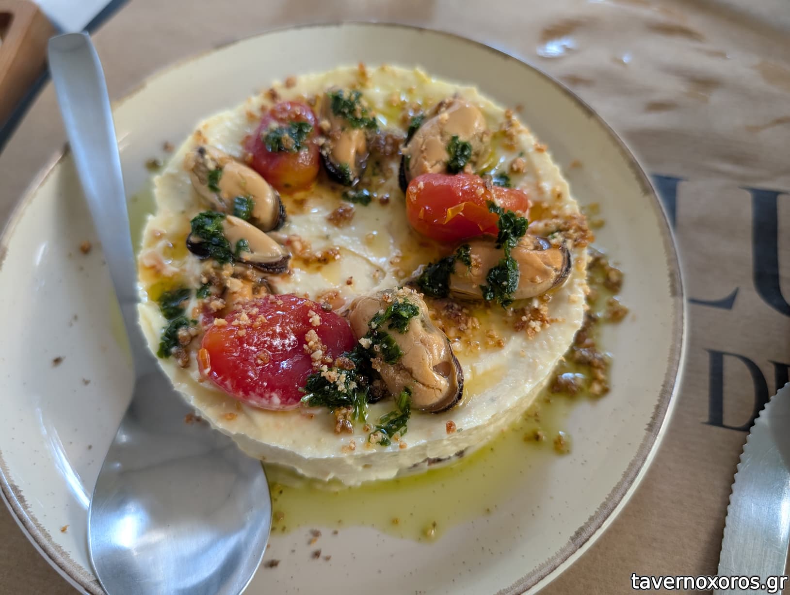 Μύδια καπνιστά, λευκός ταραμάς, φουντούκι, ντάκος χαρουπιού (καλό)