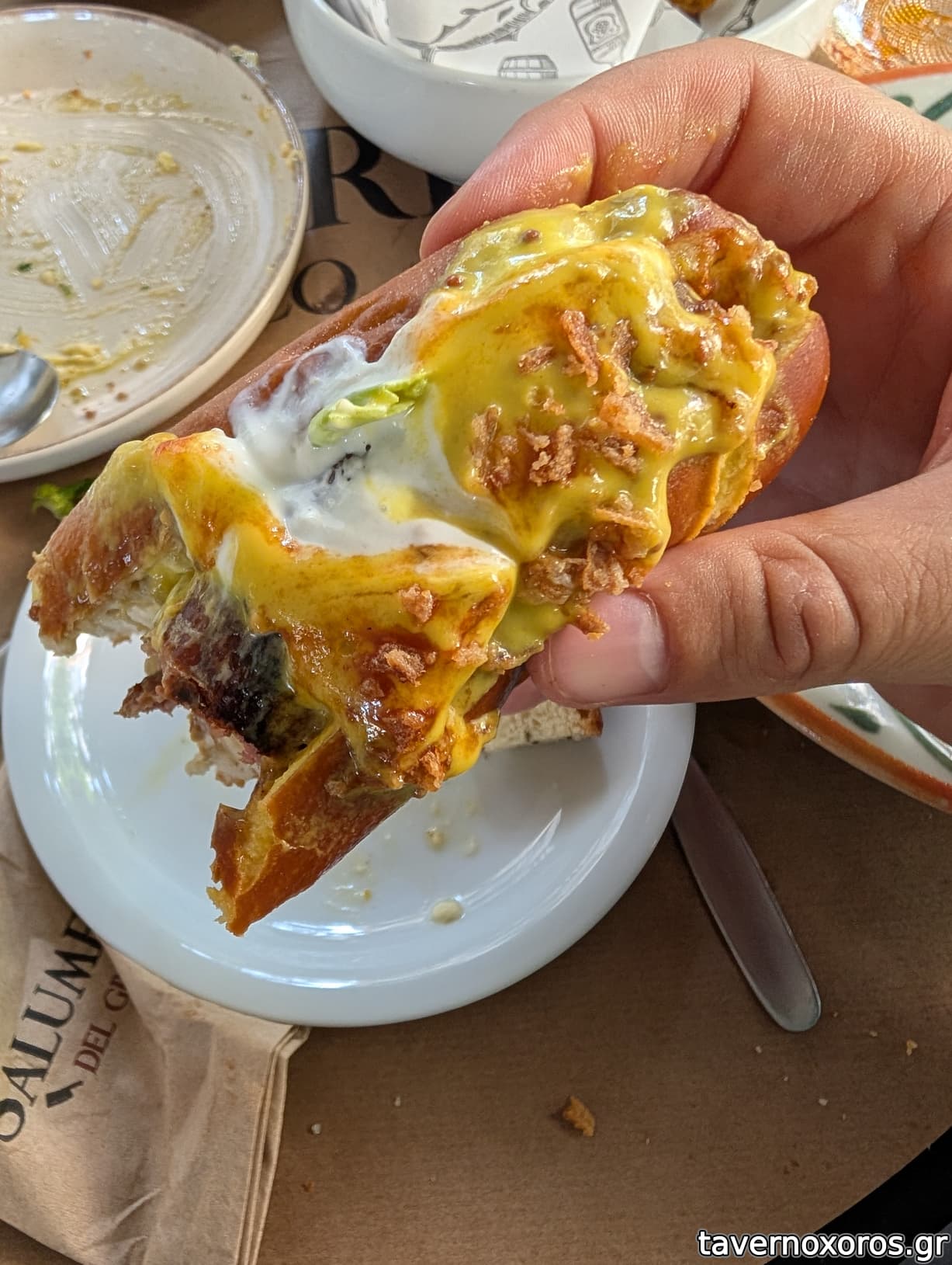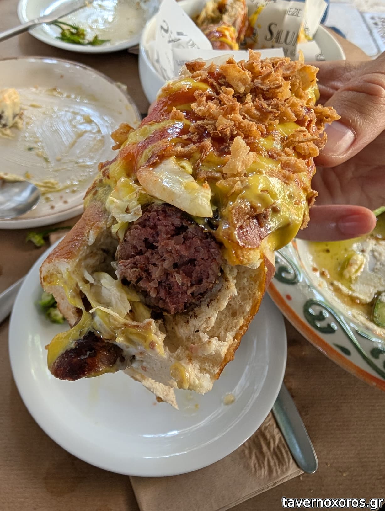 "Ελληνικό hotdog" με χωριάτικο λουκάνικο και μελιτζανοσαλάτα (έτσι και έτσι, βαρύ το λουκάνικο, εξαφανισμένη η μελιτζανοσαλάτα με τόση μουσταρδοκέτσαπ)