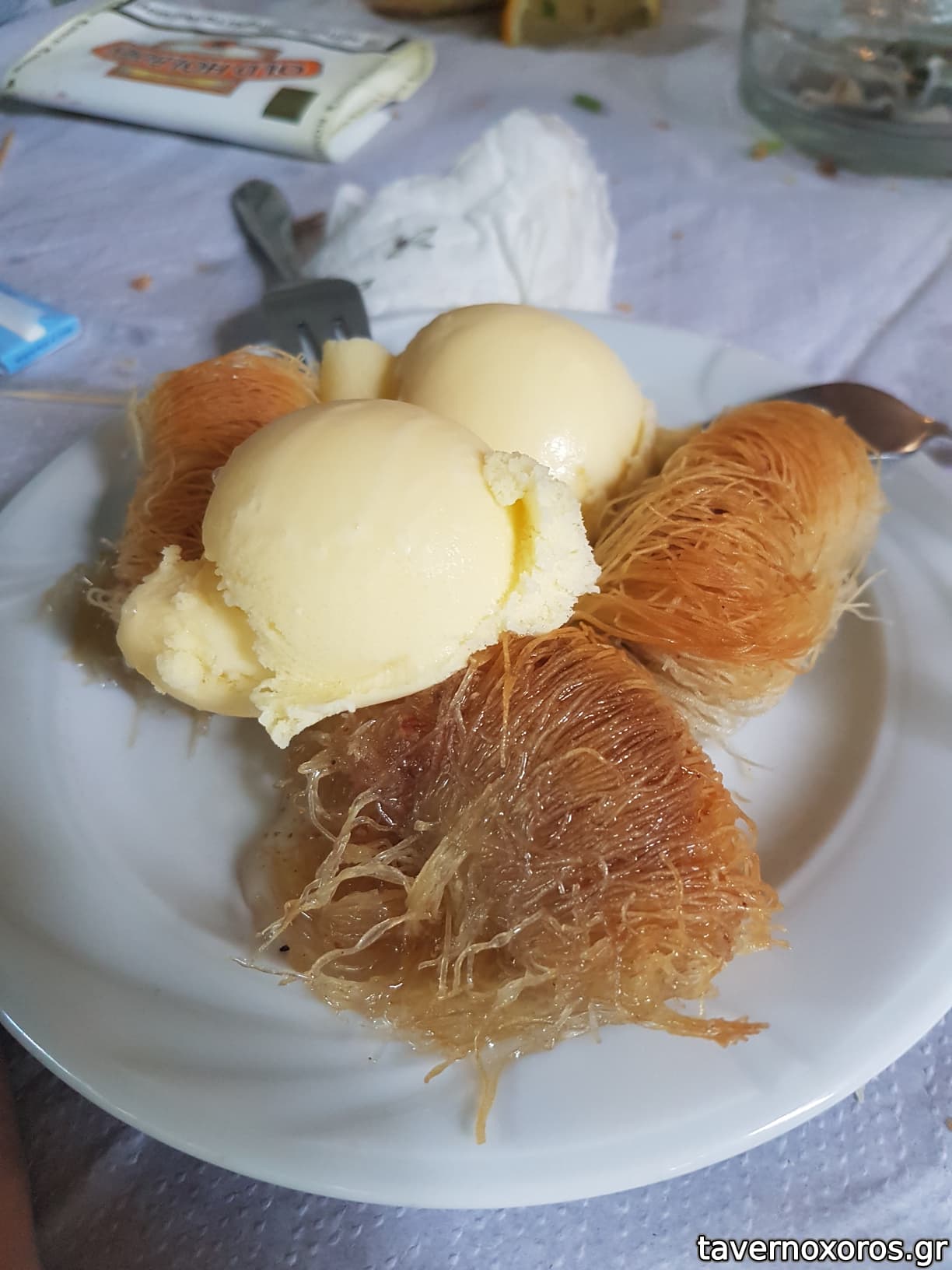 Ωραίο κερασμένο γλυκό στο τέλος, κρέπα με παγωτό και σιρόπι σοκολάτας.