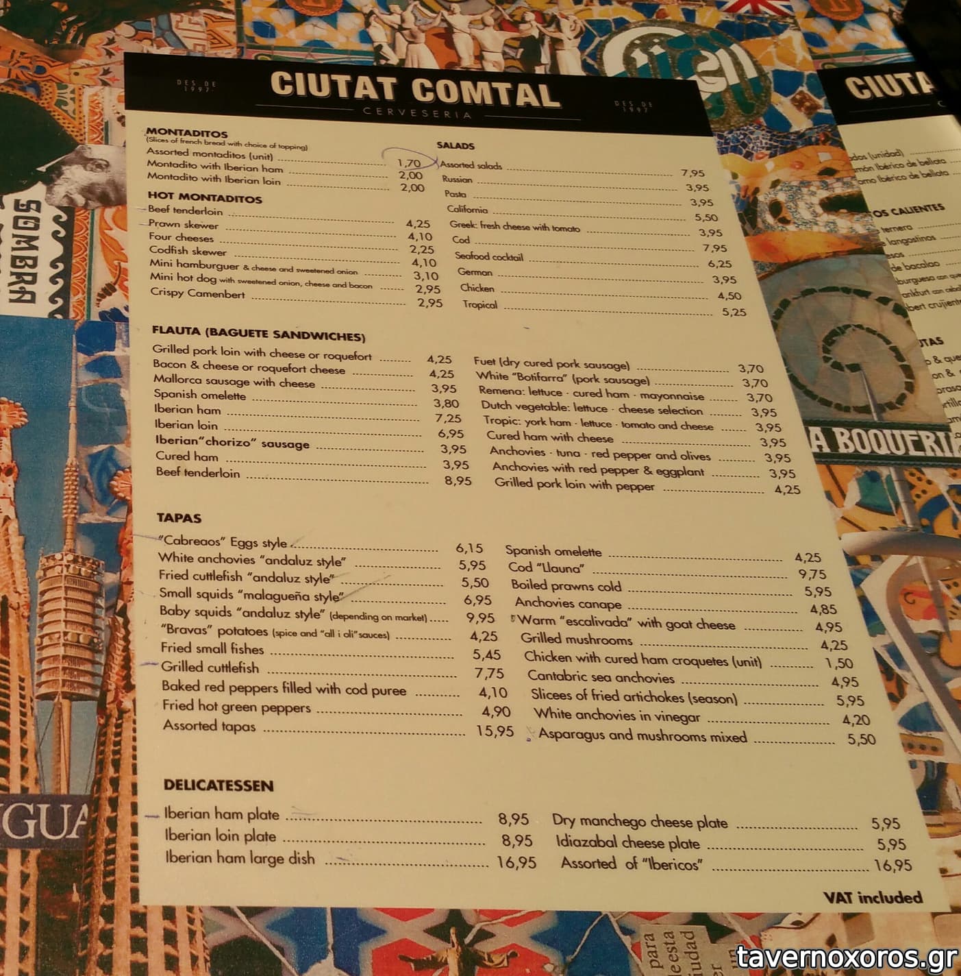 Έκατσα Φλεβάρη 2017. Το μαγαζί ήταν φίσκα και έτσι κάτσαμε έξω. Τα εξωτερικά τραπέζια είναι τρας καφενειακά, πράγμα συνηθισμένο στη Βαρκελώνη ακόμη και για σοβαρά tapas bar. Σέρβις μέτριο και τσιτωμένο, αίσθηση τουριστική και του συρμού. Από φαγητά έχει τα κλασικά τάπας. Ότι δοκίμασα ήταν οκ ή καλό, καμία αποτυχία. Τα μίνι μπεργκεράκια απόλαυση. Αλλά είναι πανάκριβο χωρίς κανένα λόγο. Στο σύνολο δε θα το πρότεινα παρόλο που δεν έχω να αντιπροτείνω κάποιο άλλο tapas στην πόλη. Όπως λέει και ο AG αξίζει μόνο για το φαγητό.