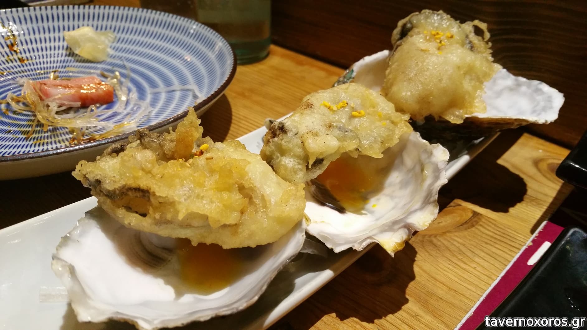 Στρείδια tempura με χυμό μάνγκο (πολύ καλό)