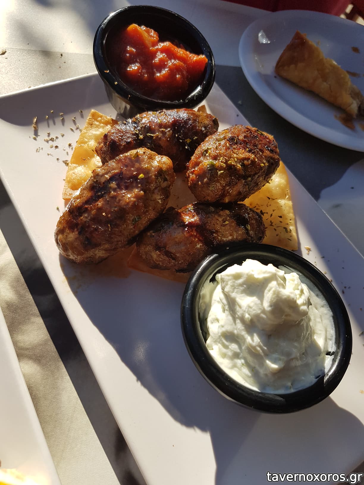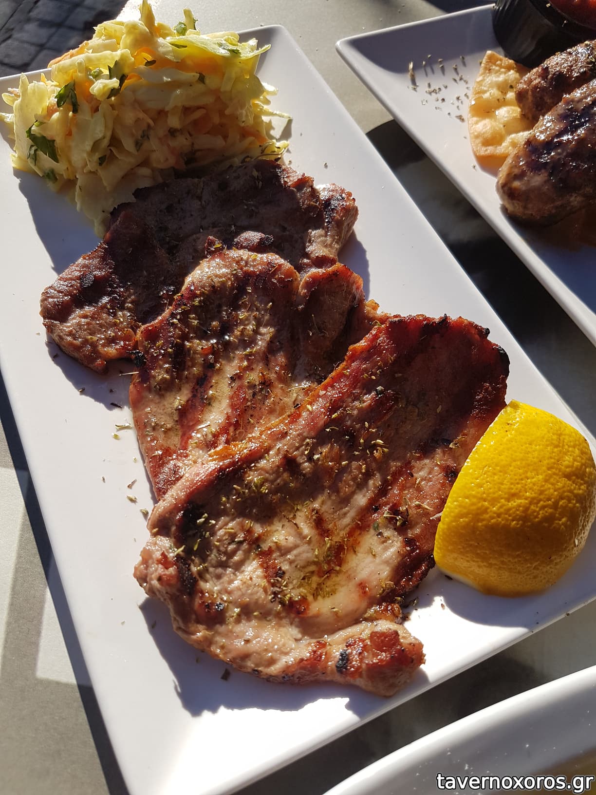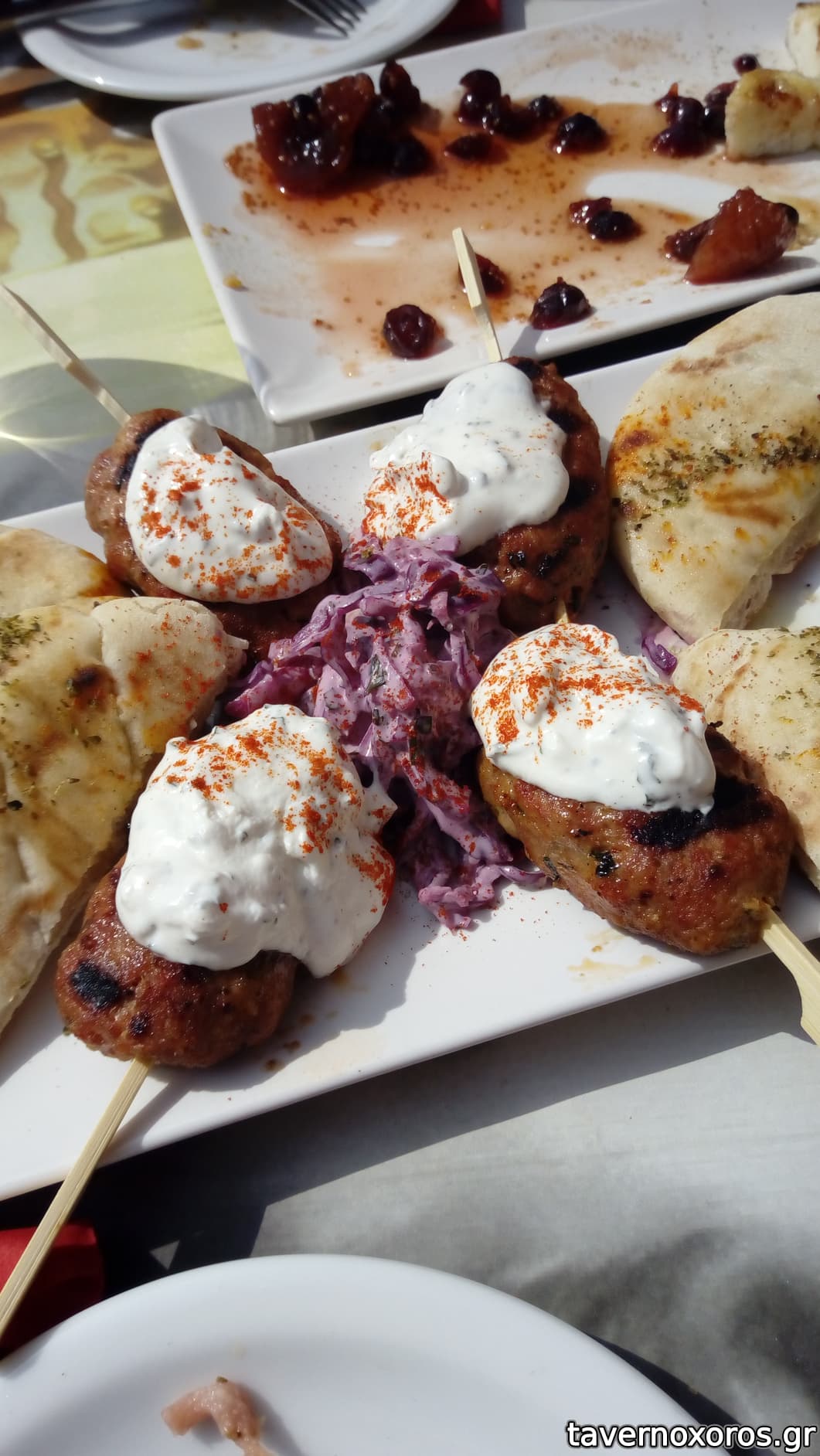 Κάτσαμε έξω και προς τιμήν τους μας άλλαξαν 2 φορές τραπέζι αγόγγυστα, ώσπου να βρούμε σκιά. Το φαγητό τώρα, το βρήκαμε καλούτσικο, σε περιποιημένο στυλ. Τα αρνίσια σουτζουκάκια και ιδίως τα κοτομπριζολάκια ήταν τα καλύτερα. Κάποιος από μας παρήγγειλε έναν μπακαλιάρο για τη μέρα, αλλά ήταν εντελώς άκυρος.. Ποτά μπύρα και λευκό κρασί εμφιαλωμένο, καλό.