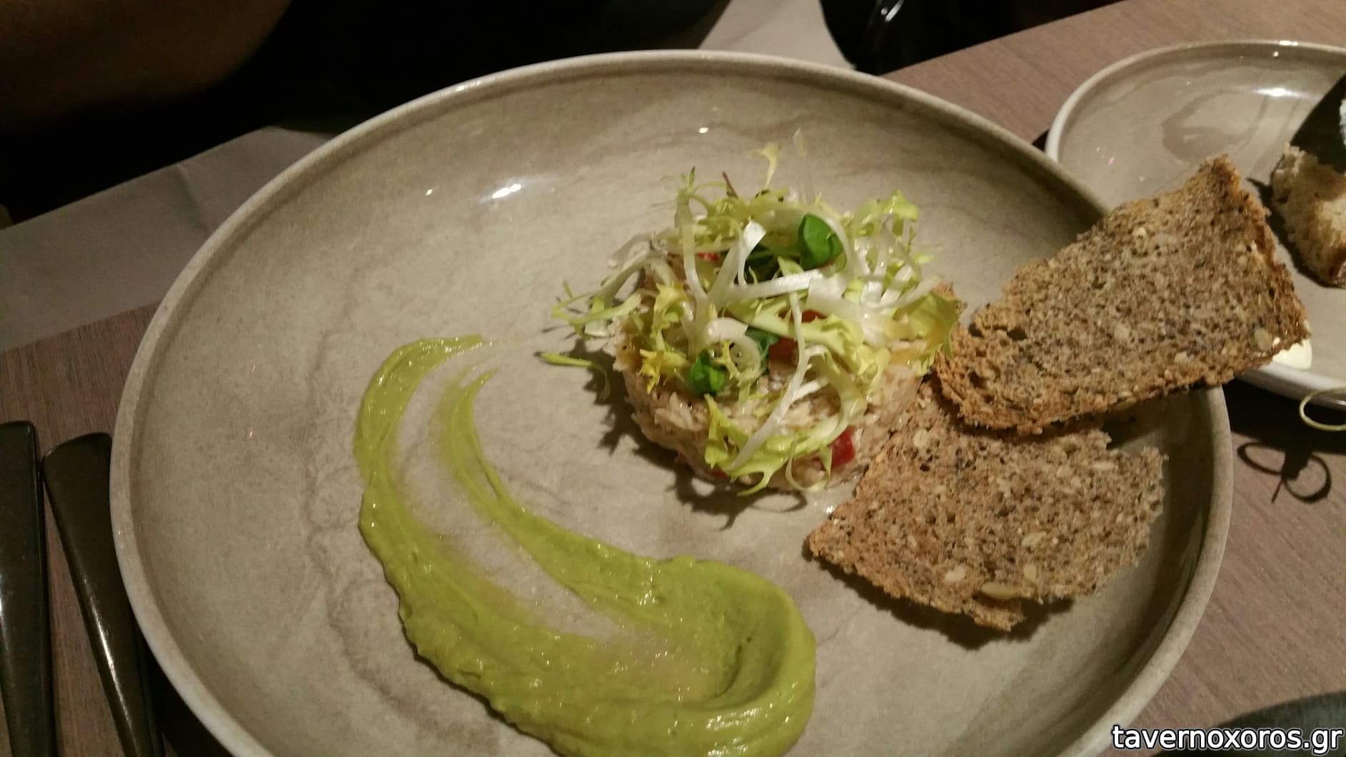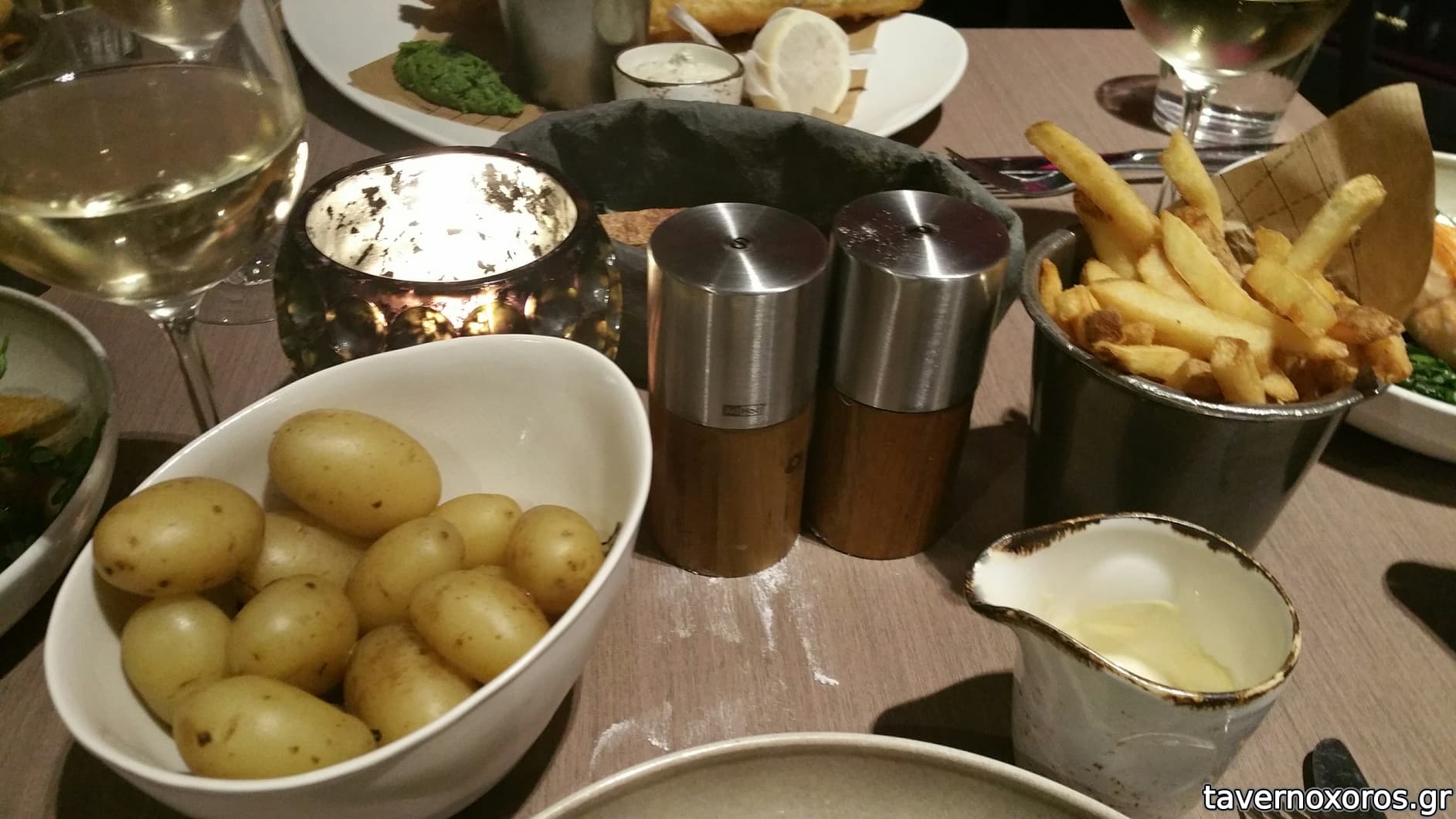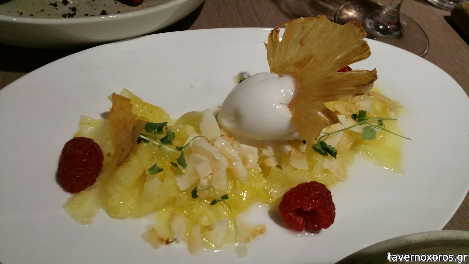 φαγητό ήταν καλύτερο από ό,τι περίμενα. Οι μερίδες τους ήταν καλές σε μέγεθος, παρουσίαση και γέυση. Από τα ορεκτικά όλα ήταν πάνω κάτω οκ, στα κυρίως, το λαυράκι ήταν πολύ καλό όπως και ο σολομός ο ποίος ήταν σερβιρισμένος με μύδια και βραστά αγριόχορτα καθώς και ένα ζωμό από τα μύδια τον οποίο μας τον περιέχυσε από πάνω. Τα γλυκά επίσης ήταν αρκετά καλά.