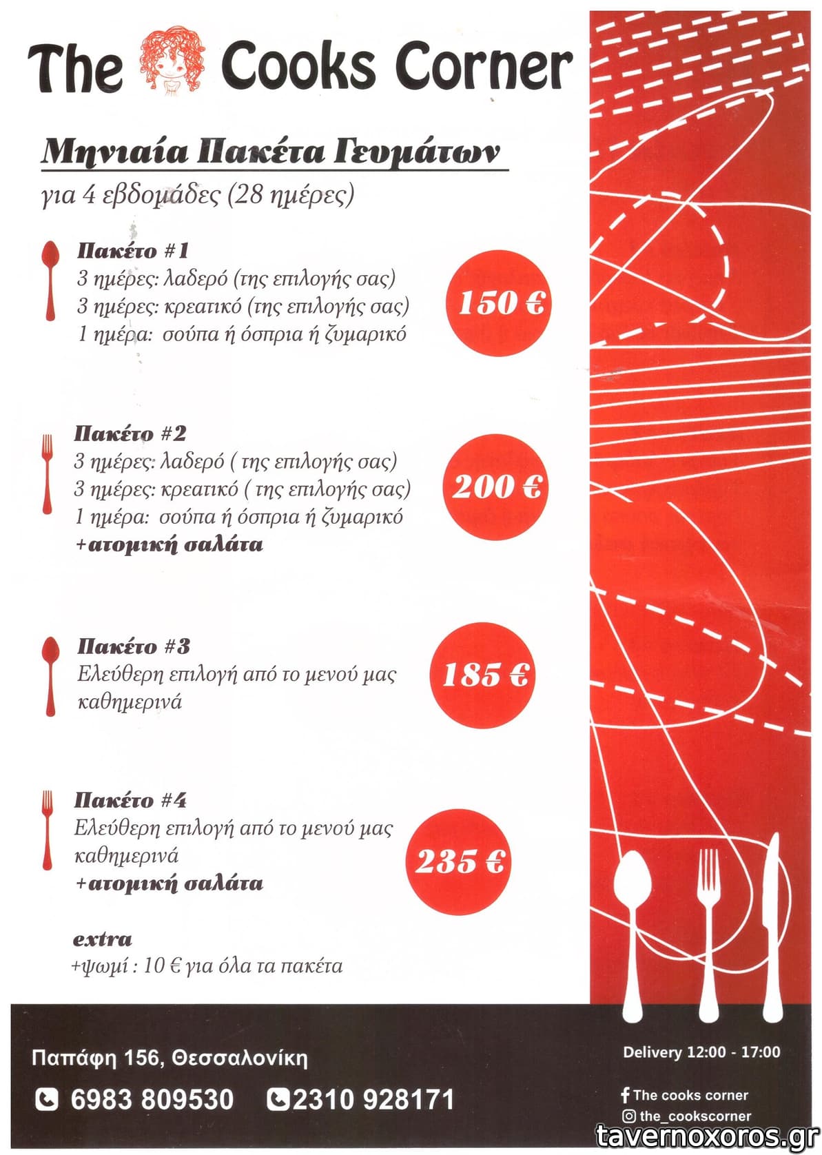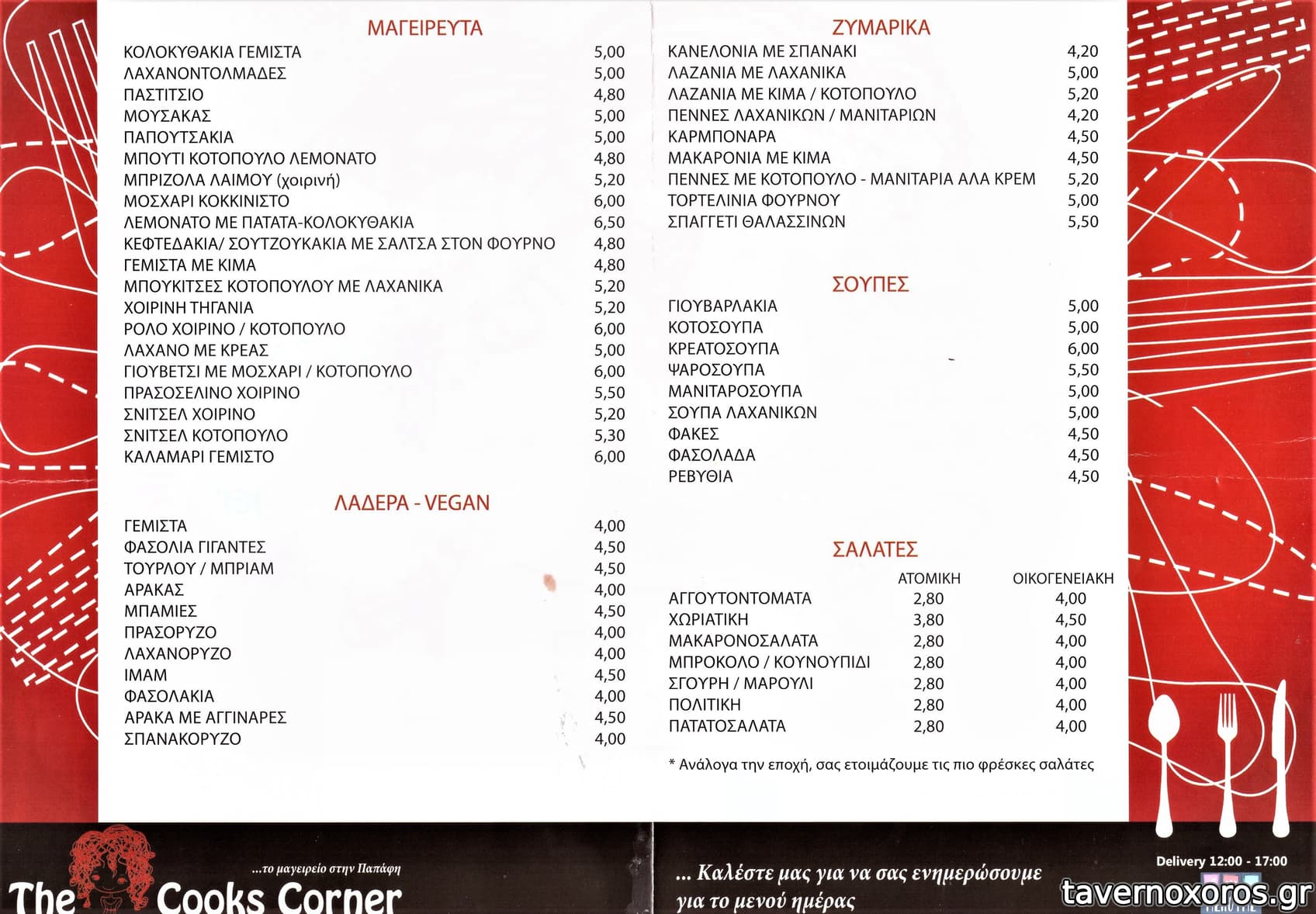 Έχουμε παραγγείλει αρκετές φορές ντελίβερι. Δοκιμάσαμε μουσακά, παπουτσάκια, χοιρινό με λάχανο, λουκάνικα με πατάτες γιαχνί, κανελόνια με σπανάκι, λαχανοντολμάδες, αρακά, μυδοπίλαφο, μοσχαράκι κοκκινιστό με πατάτες φούρνου και σνιτσελάκια κοτόπουλο (βλ. φωτο).