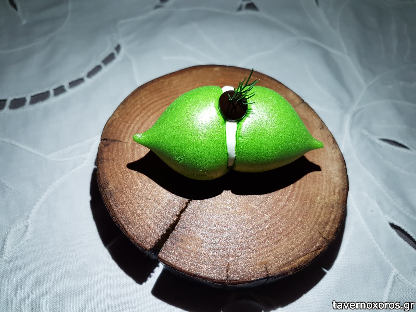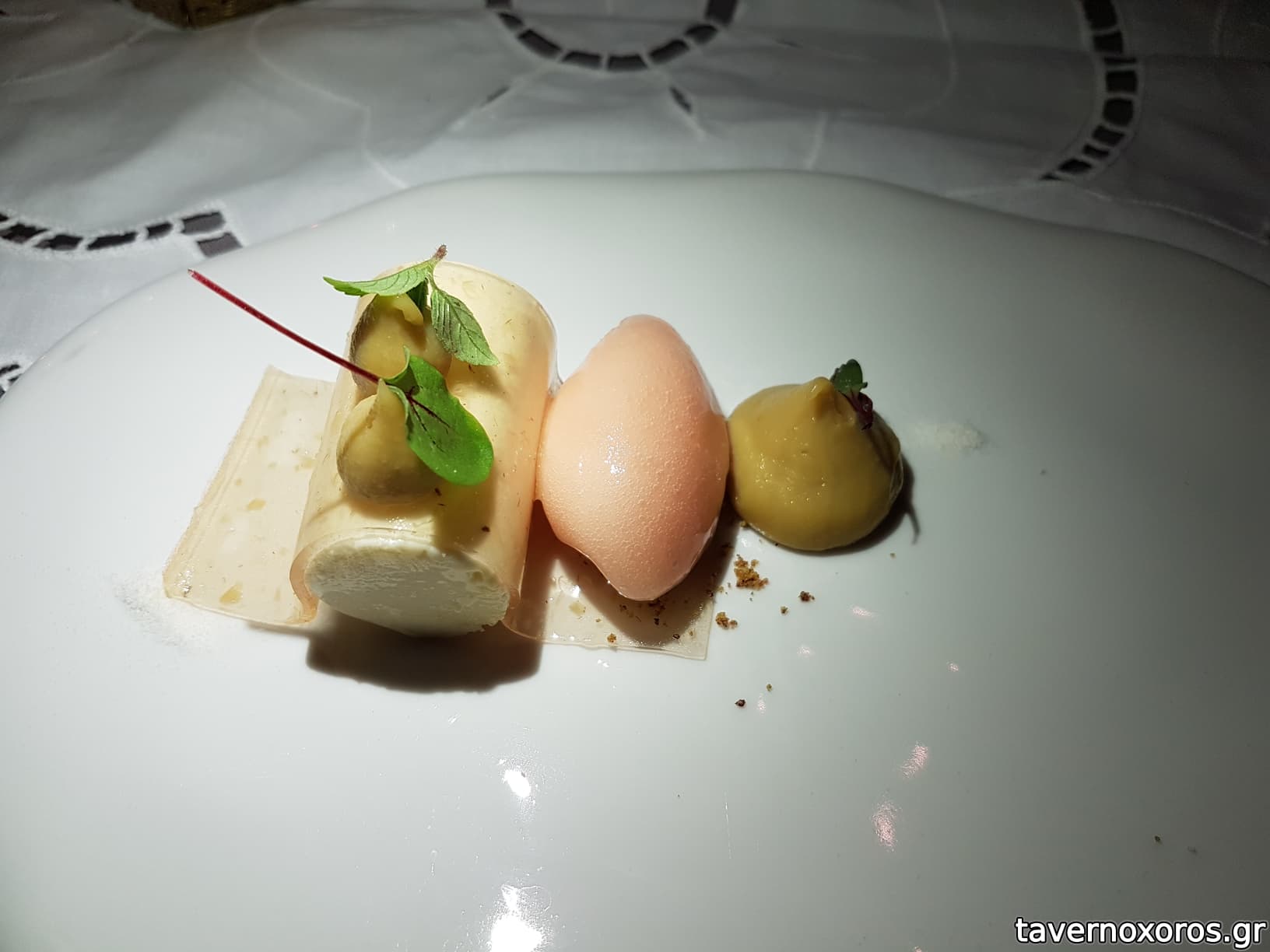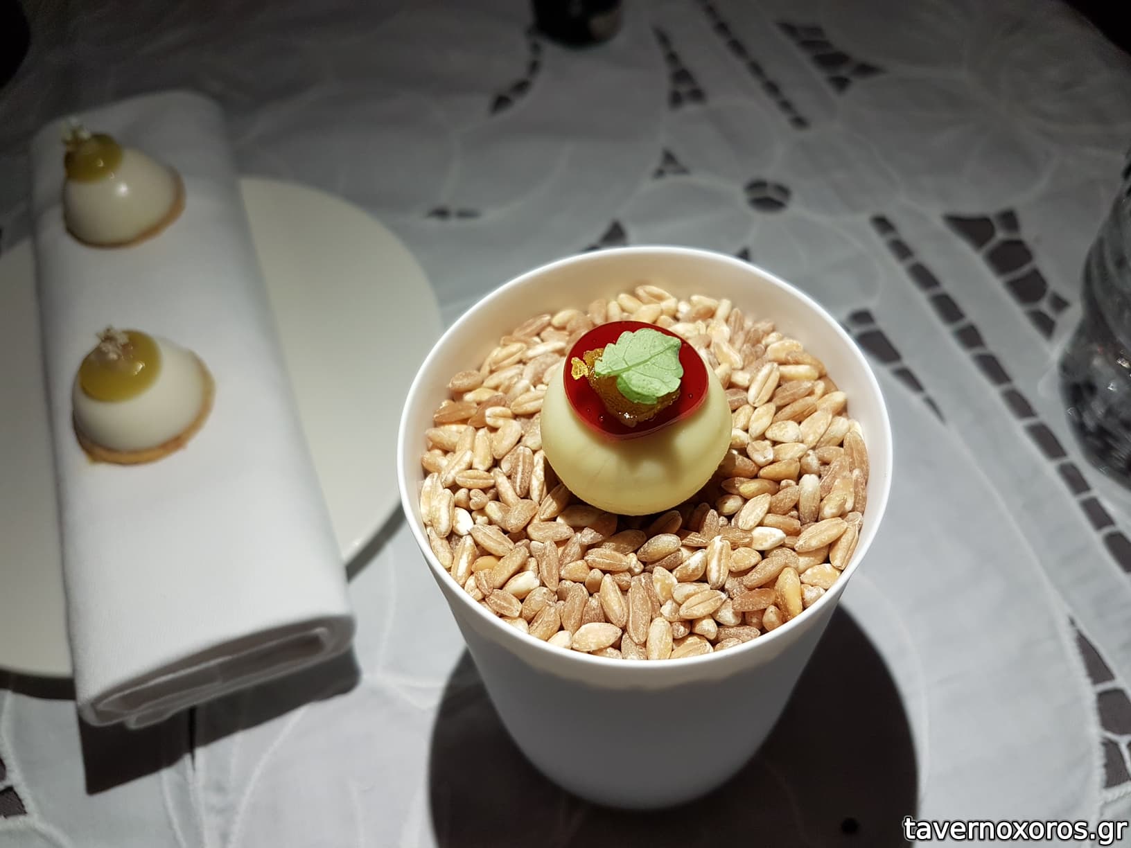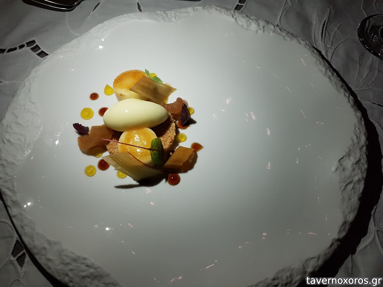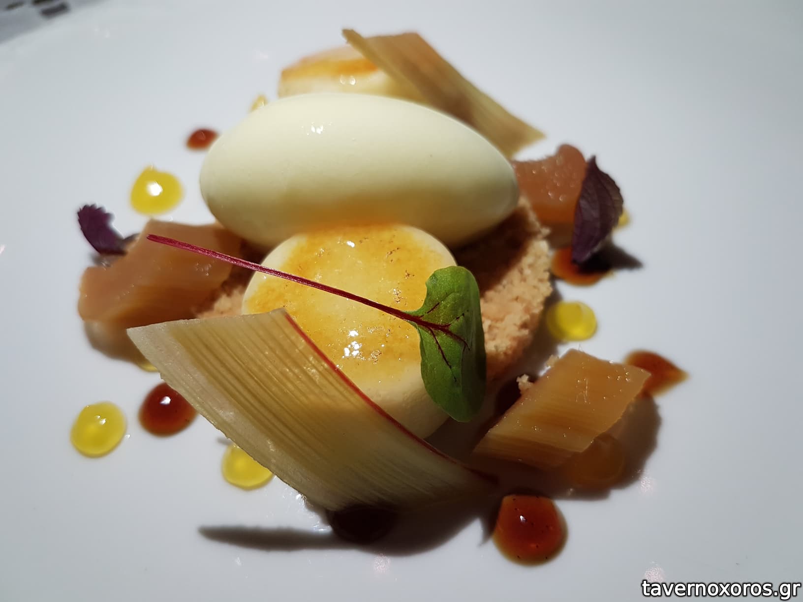 Degustation 3/14: "Κάψουλα / Μήλο, λευκή σοκολάτα, crème de cassis, αυγοτάραχο" (μέτριο)
