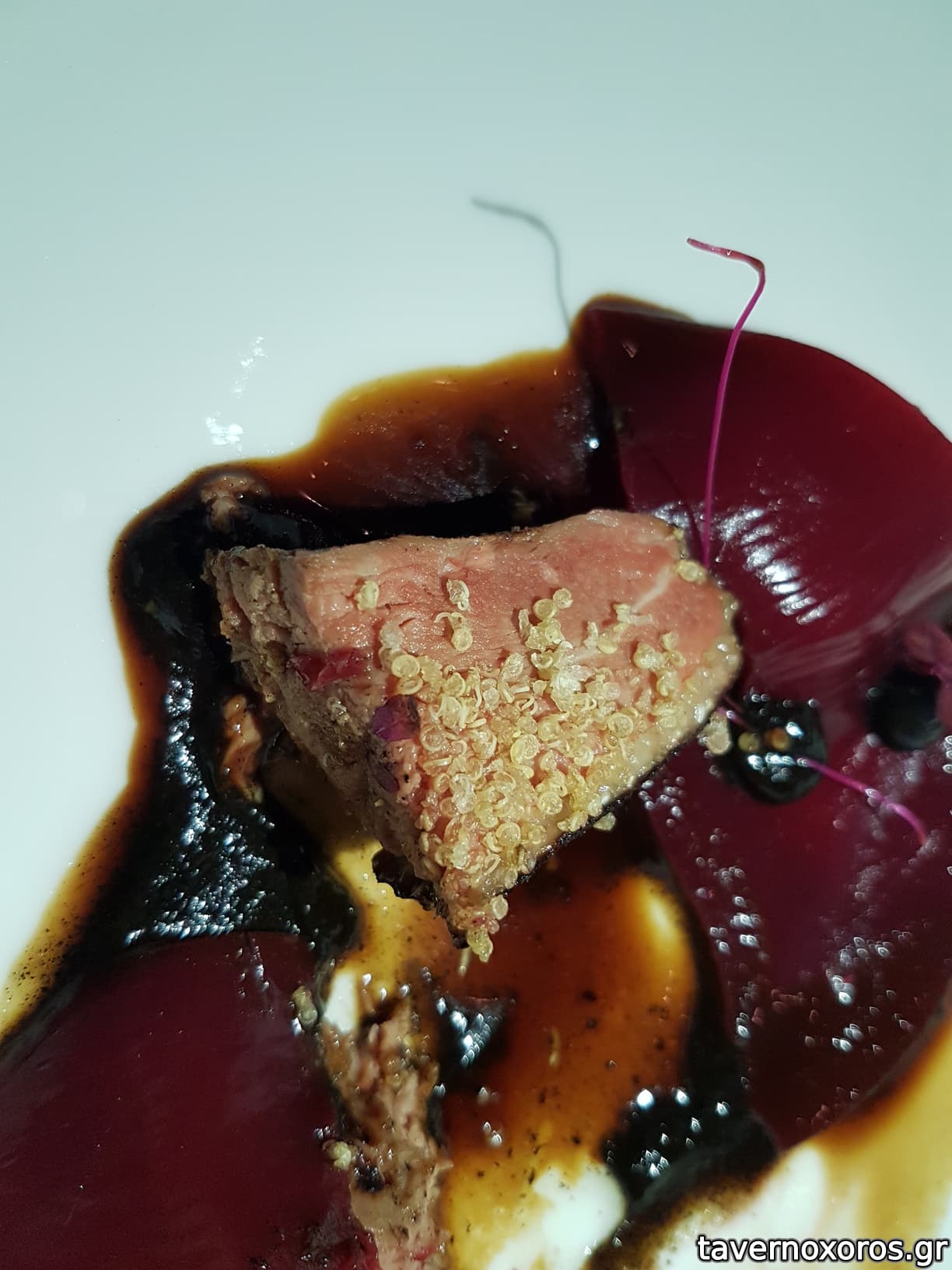 Degustation 9/14: "Πάπια Challans / Raspberry, κουμκουάτ, κινόα, κρεμμύδι BBQ" (κακό, η πάπια άνοστη μιας και είχε ψηθεί σε sous-vide, και καμένη εξωτερικά)