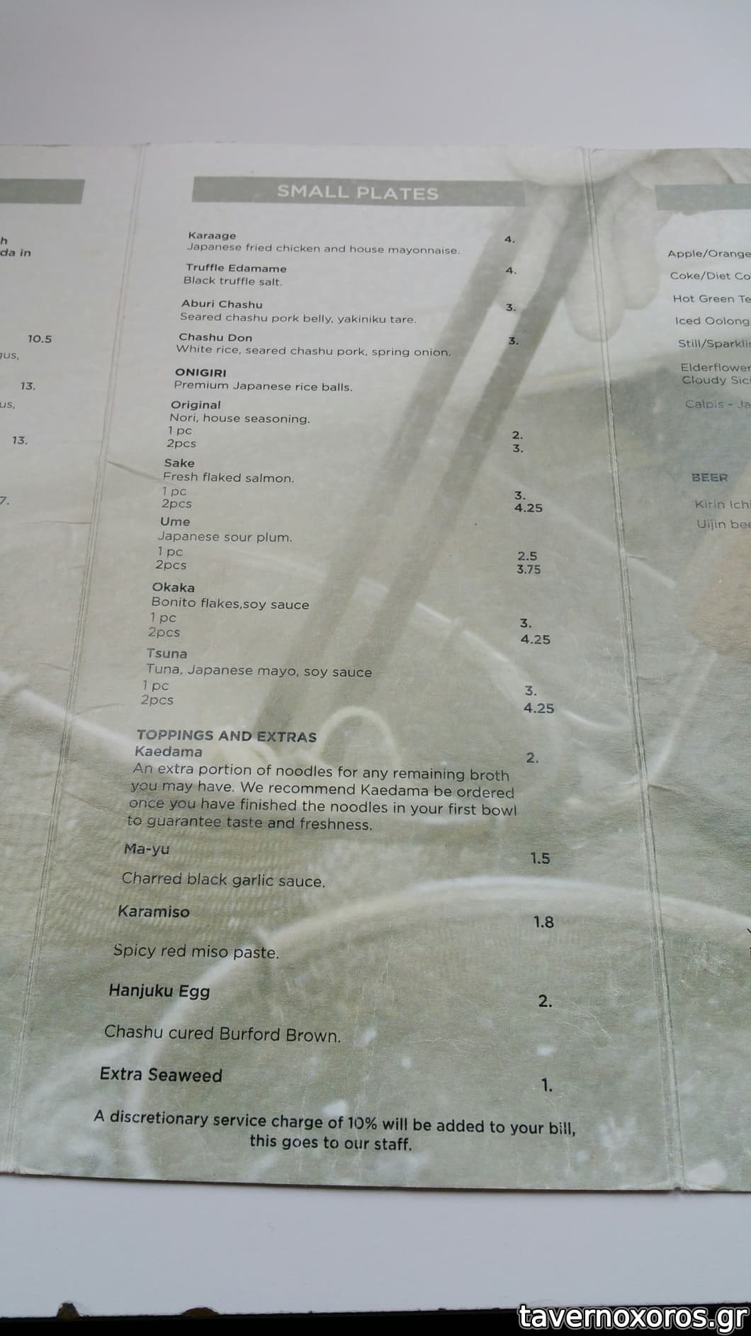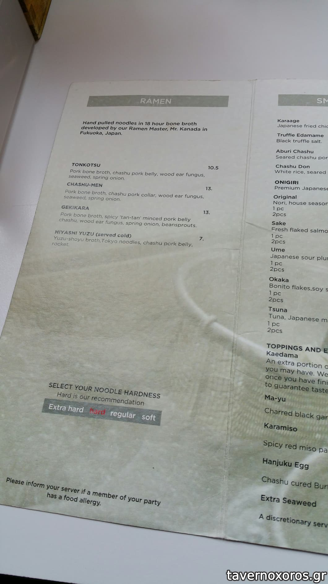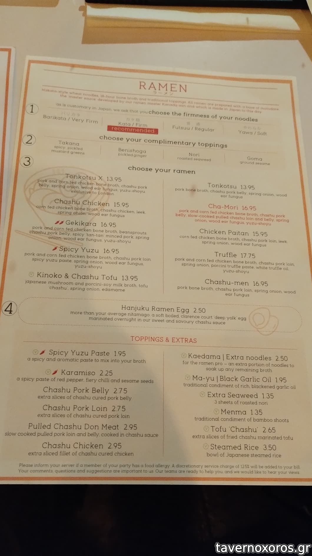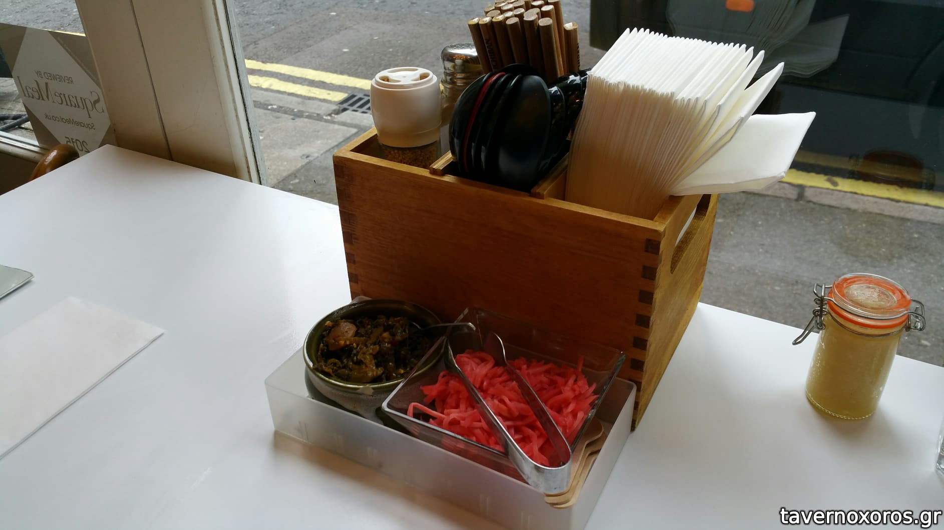 Πήραμε μόνον Ramen- εγώ πήρα τα Tonkotsu X, με medium σκληρά Ramen. Είναι όντως πολύ καλή φάση- ο ζωμός είναι φοβερός: πυκνός, δεμένος, και τα wood ear mushrooms δίνουν μια γεύση καρυδιού, πολύ μοναδική γεύση. Στη λίστα μου για τα δυνατά ασιατικά χαρτιά του Λονδίνου.