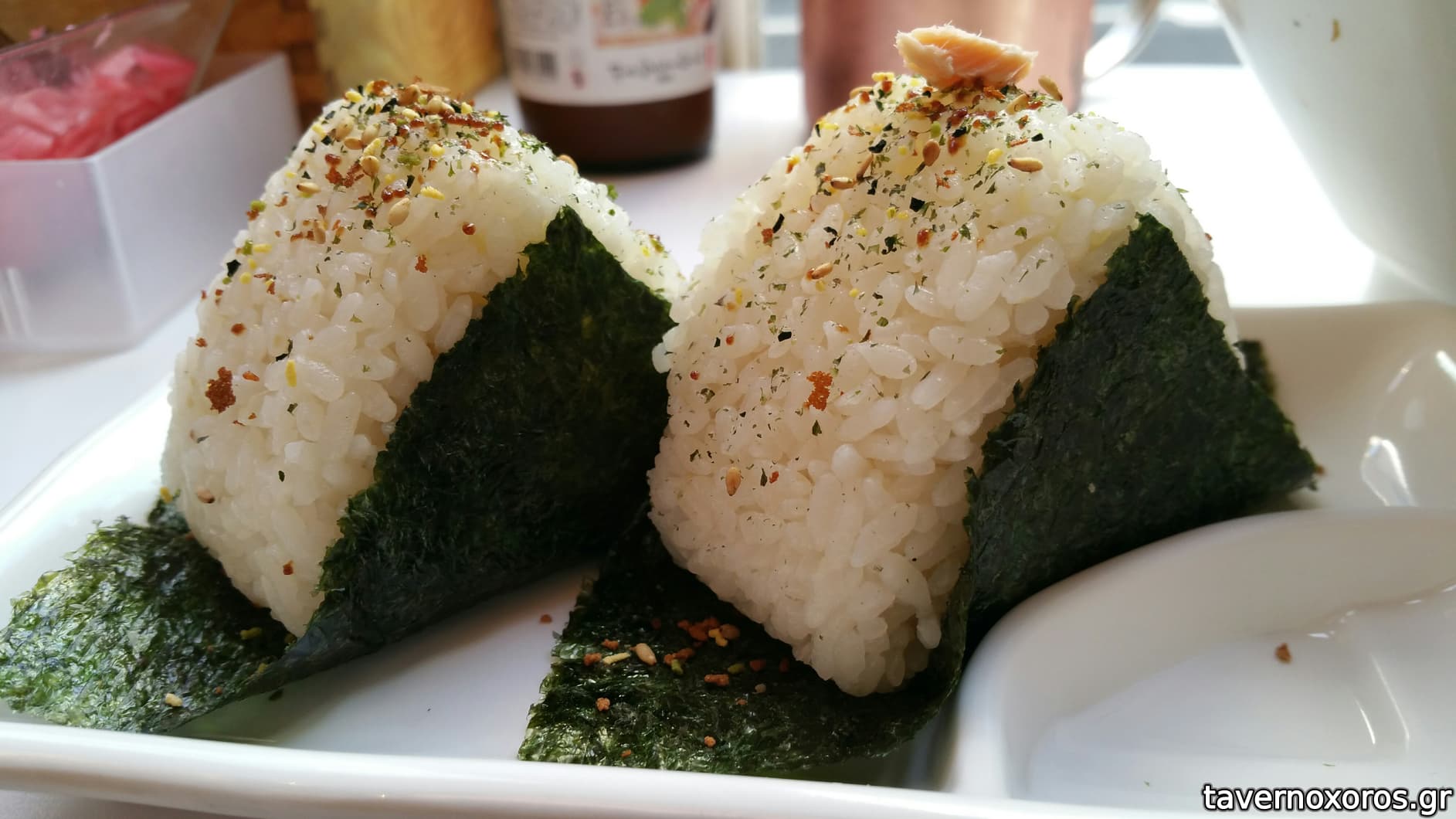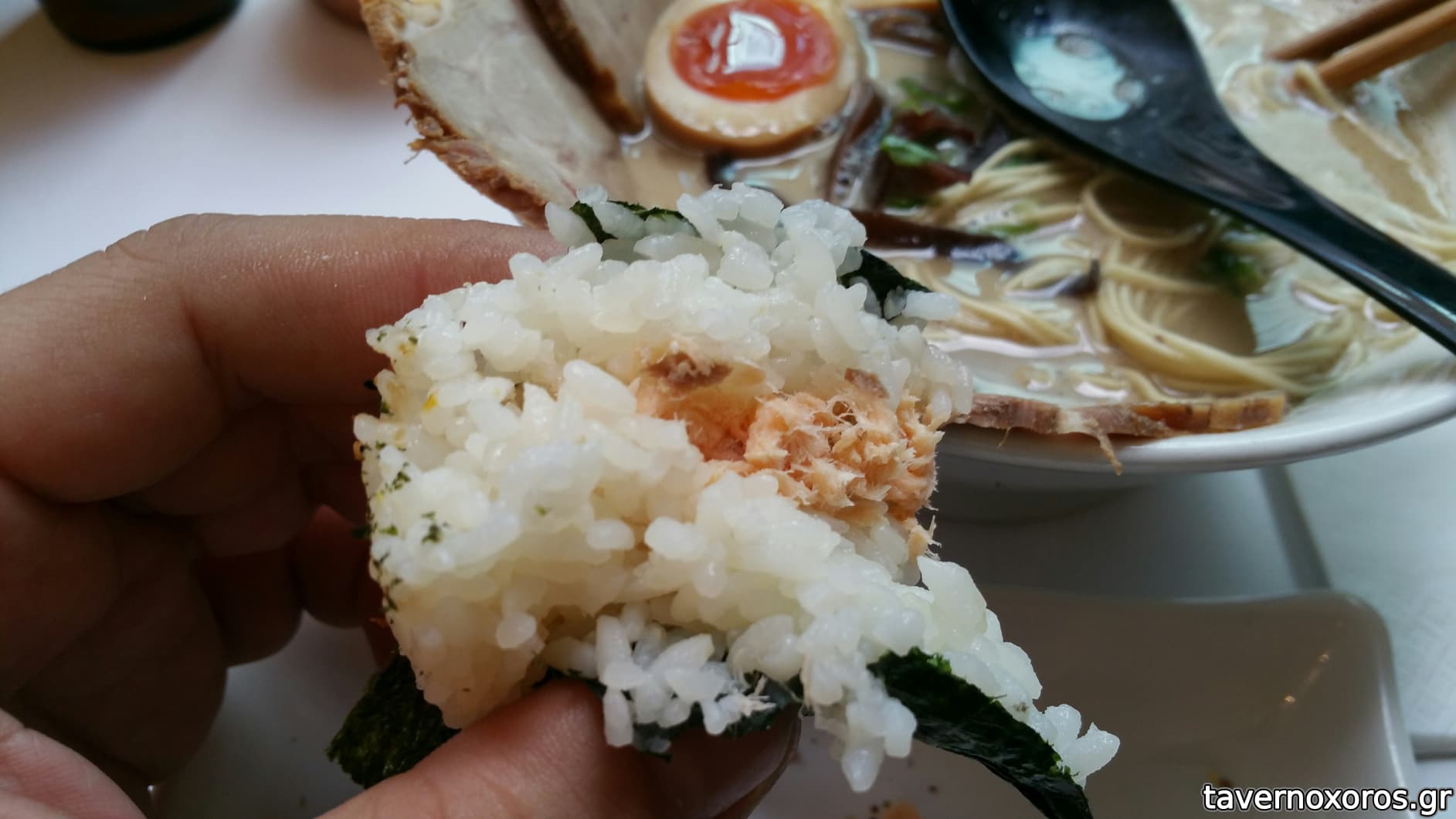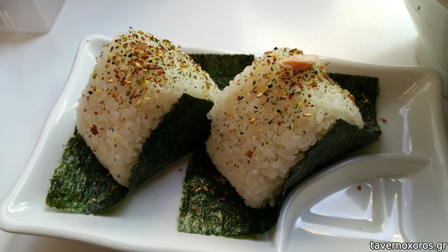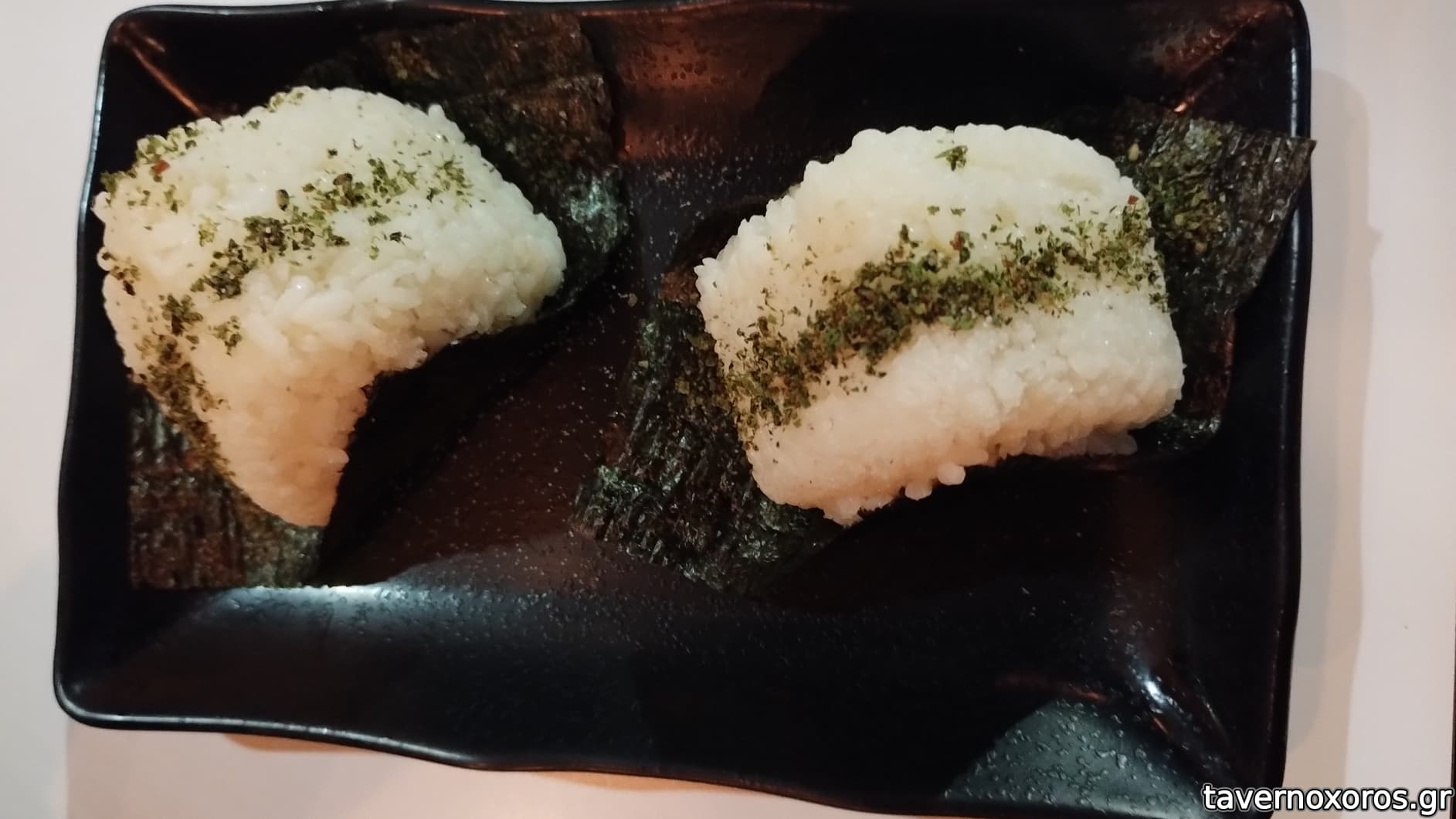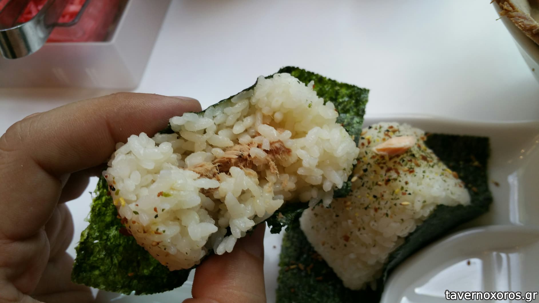Onigiri σολομού (μέτρια, πολύ στεγνά. Στη 2η μερίδα της παρέας ζήτησα και μάς έφεραν soy sauce & επίσης chili oil, λίγο καλύτερα έτσι)