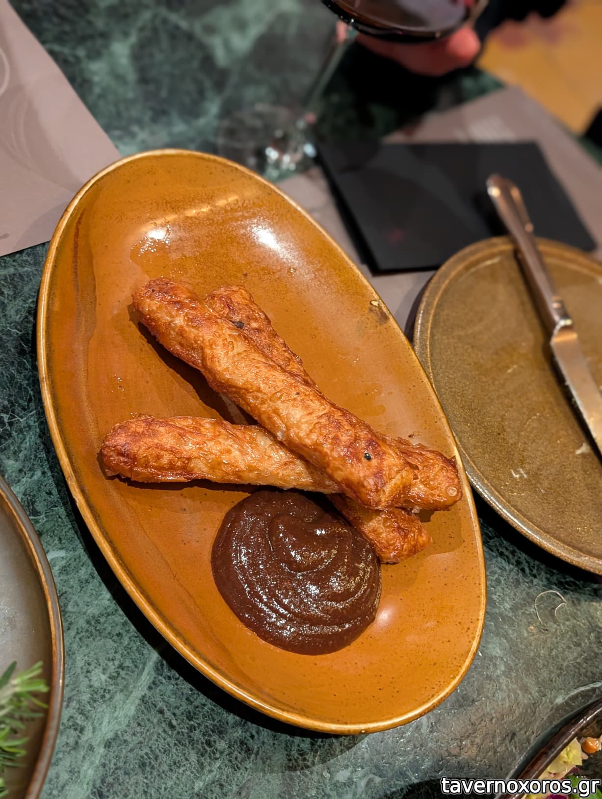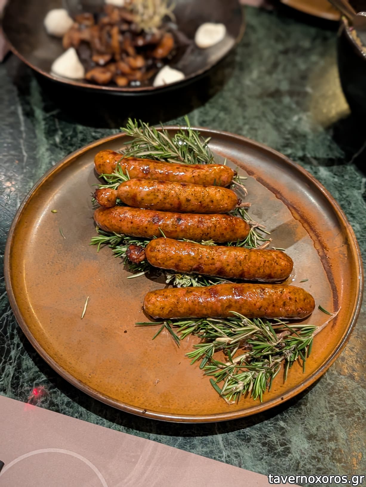 Χειροποίητα λουκανικάκια καπνιστά στον ξυλόφουρνο (πολύ καλά, ειλικρινά δεν καταλαβαίνω σε τι ωφελεί τόσο δεντρολίβανο στο πιάτο, ειδικά όταν πουλάς "βιωσιμότητα")