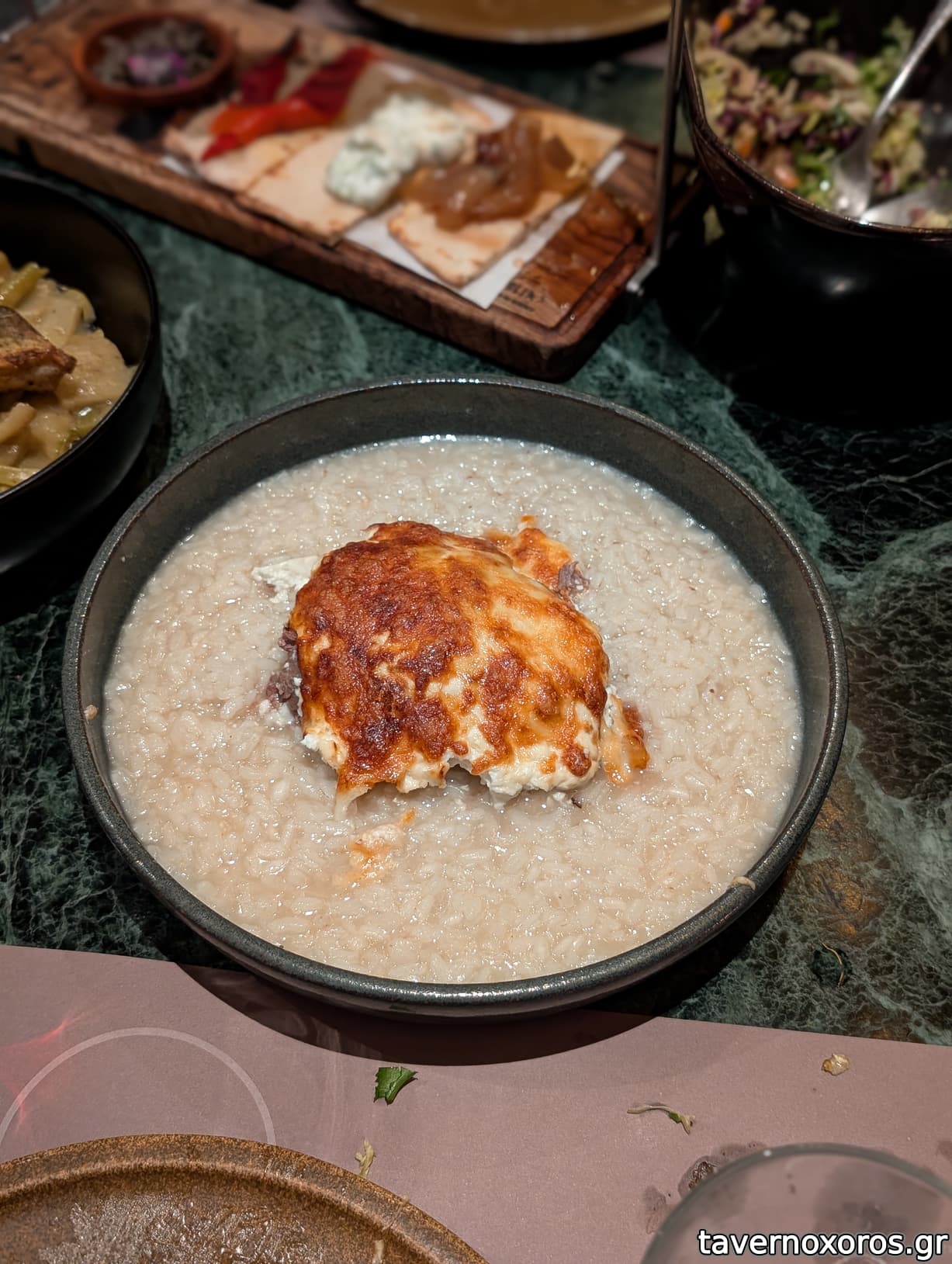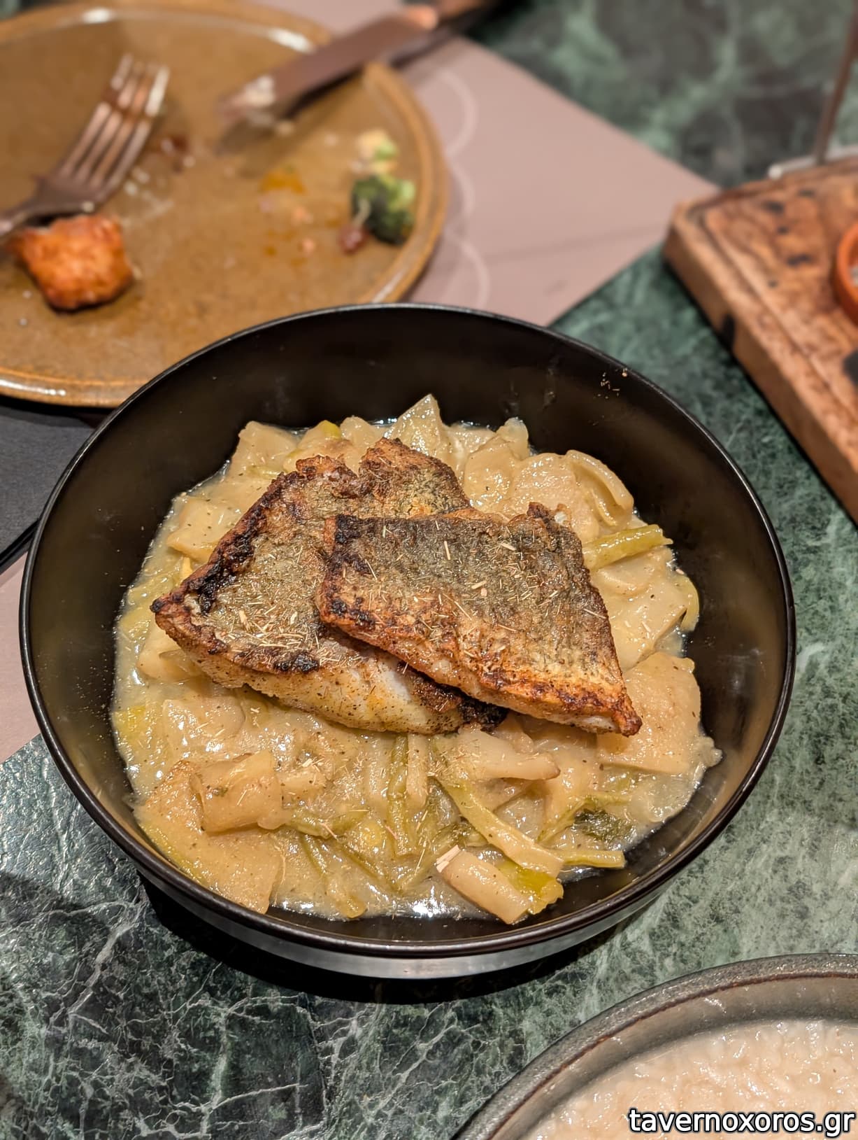 Φάβα από μαναρόλια με γαύρο μαρινάτο, σταφιδολιές, ασκορδουλάκους και παξιμάδι εφτάζυμο (απλώς οκ, δεν κατάλαβα τι ρόλο έπαιζε ο γαύρος μαρινάτος, οι ασκορδουλάκοι τουρσί πολύ καλοί)